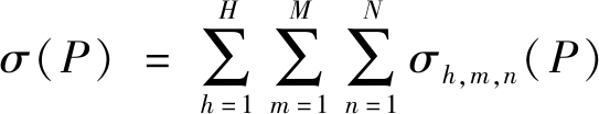 由式(8)可看出,频率多样性及谐波标签和接收天线的角度多样性是很重要的采样资源,它们共同确定了空间谱域的覆盖范围,且其半径由最大基频查询信号频率决定。由于采样数据是离散的,所以将式(8)中的变量(kx,ky,kz)利用Jacob行列式Jh,m,n转换为(fh,θm,φm),得到转换后的目标定位函数σh,m,n(P),即由第h个频率、第m个谐波标签和第n个接收天线确定的定位结果。