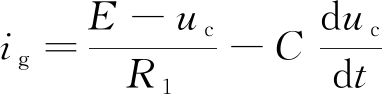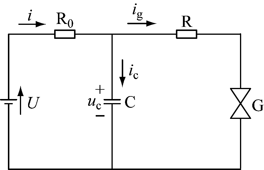 容性电路短路火花放电原理如图1所示[10]。图1中,R0为充电电阻,R为放电电阻,U为电源电压,C为滤波电容,G为火花试验装置,i为电源电流,ig为放电电流,ic为电容电流,uc为电容两端电压。容性电路火花放电特性曲线如图2所示[16]。