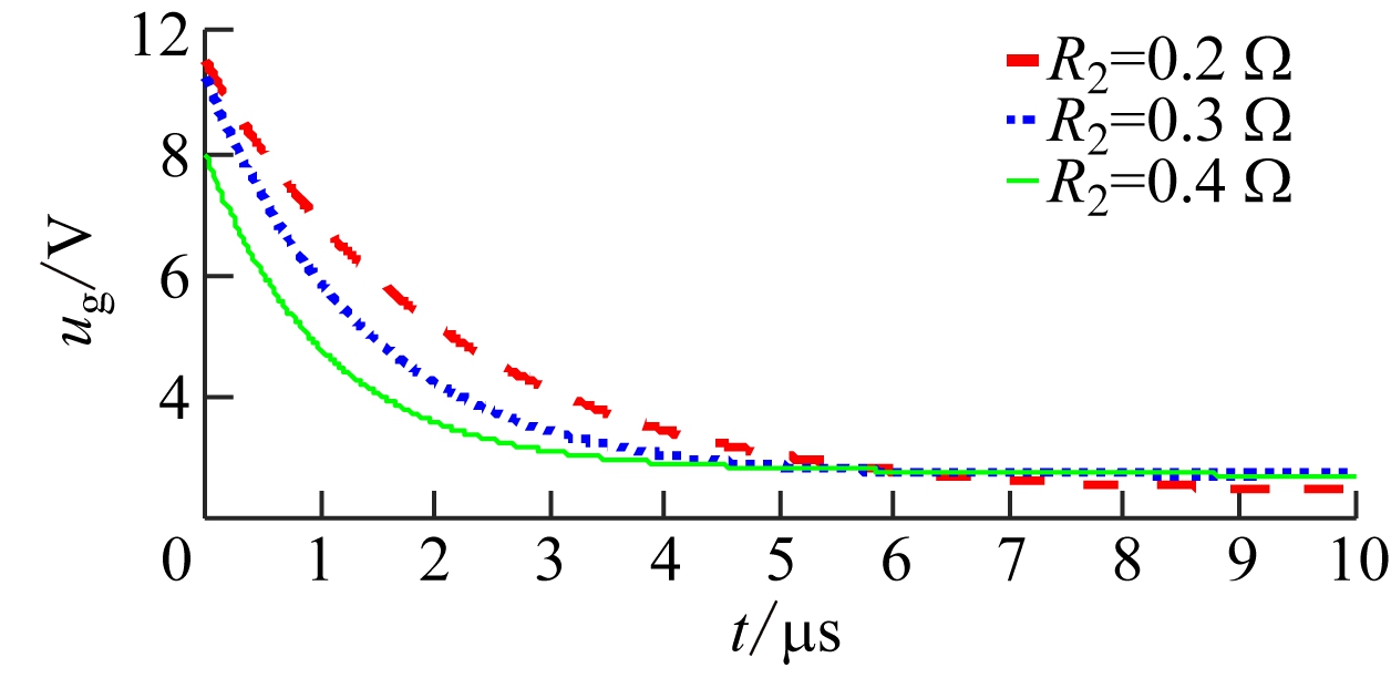 在充电电阻R1=10 Ω,电源电势E=12 V,滤波电容C=100 μF,短路等效电感Ls=300 nH,建弧电压Uh=5 V,负载电流I0=2.5 A的条件下,取短路时回路电阻R2分别为典型值 0.2,0.3,0.4 Ω,对EC电路短路火花放电的影响进行仿真分析,结果如图6所示。
