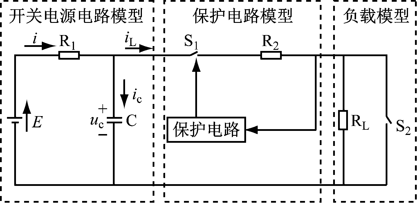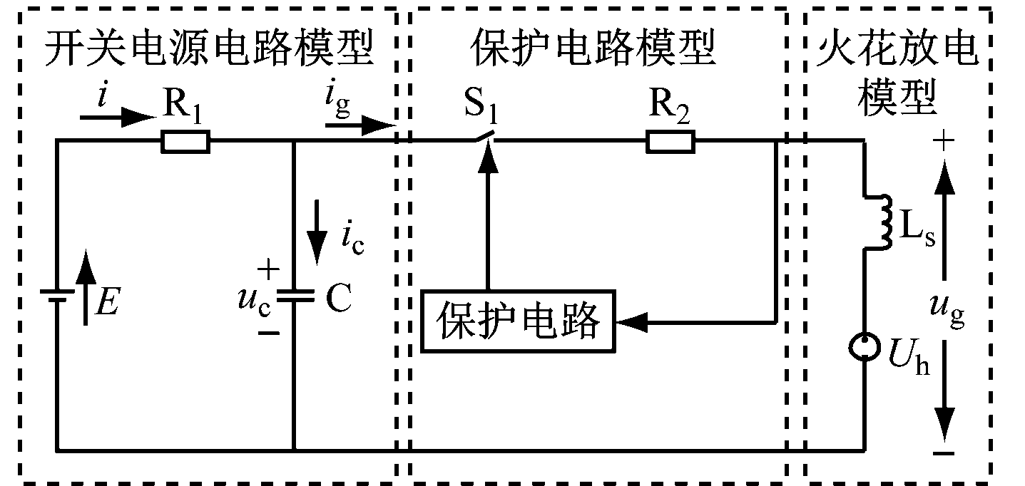 为了进一步分析容性电路短路火花放电影响因素,将容性电路等效为如图3所示的EC电路[11]。短路前,EC电路模型如图3(a)所示,等效的开关电源电路模型中,E为电源电势,R1为充电电阻,iL为负载电流;等效的保护电路模型中,S1为保护开关器件,当遇到过流过压及短路等故障时开关断开,R2为短路回路电阻,通常情况下R2远小于R1,以避免放电过程中对电源电势E的影响[10];等效的负载模型中,RL为电源负载,S2为短路开关,当S2闭合时,电路发生短路故障。短路后EC电路模型如图3(b)所示,等效的开关电源电路模型和等效的保护电路模型同图3(a),等效的火花放电模型中,由于短路后火花放电电流和放电电压不能立刻突变,所以, 用短路等效电感Ls等效[18]。Uh为发生火花放电的建弧电压[19],ug为火花放电时输出端电压。