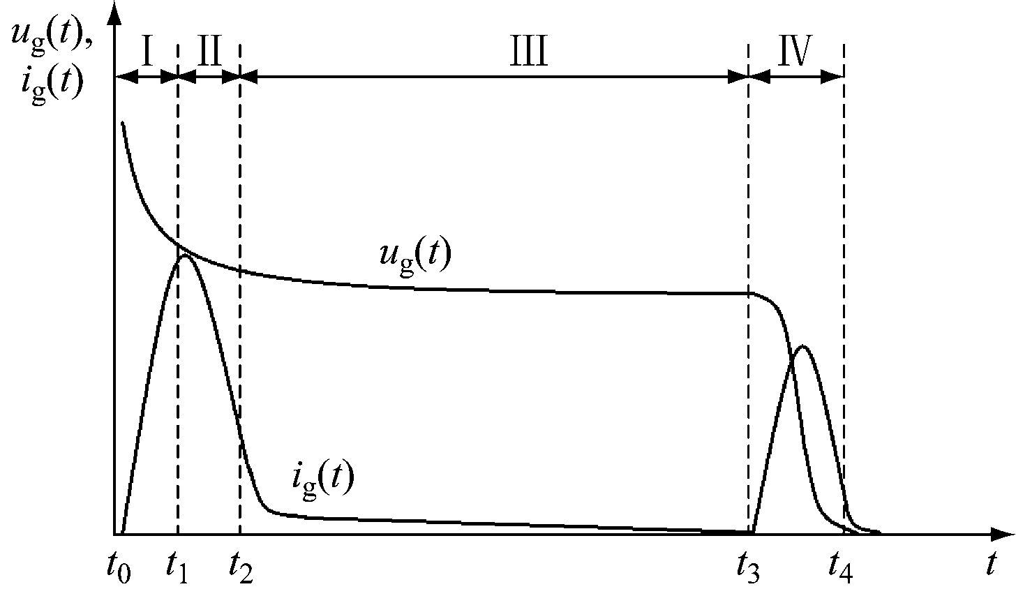 第Ⅰ阶段,对应图2中的t0~t1段,此阶段为击穿介质阶段。初始电极触点断开,当触点不断接近,到该电压击穿介质的距离时,气体介质被击穿,此时放电电流(ig(t))迅速上升,放电电压(ug(t))迅速下降。