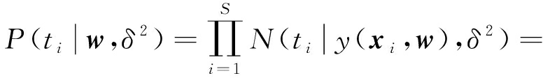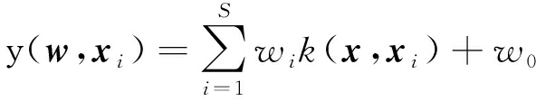 式中:y(w,xi)为由权值决定的输出值;w为S+1维权值wj组成的向量,j=0,1,…,S,即w=[w0,w1,…,wj,…,wS]T;x是由xi组成的矩阵,即x=[x1,x2,…,xi,…,xS]T;εi为第i个噪声误差,εi~N(0,δ2),N(·)为高斯分布,δ2为高斯噪声的方差;k(x,xi)为核函数k(xn,xi)组成的核向量,即k(x,xi)=[k(x1,xi),k(x2,xi),…,k(xi,xi),…,k(xS,xi)],n=1,2,…,S。