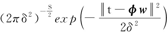 为训练集中第i组输入向量,S为训练集样本数,RD为D维实数域;t为训练样本输出值ti组成的目标向量,即t=[t1,t2,…,ti,…,tS]T,ti为第i个训练样本输出值,i=1,2,…,S。RVM回归的输入与输出之间的关系为
