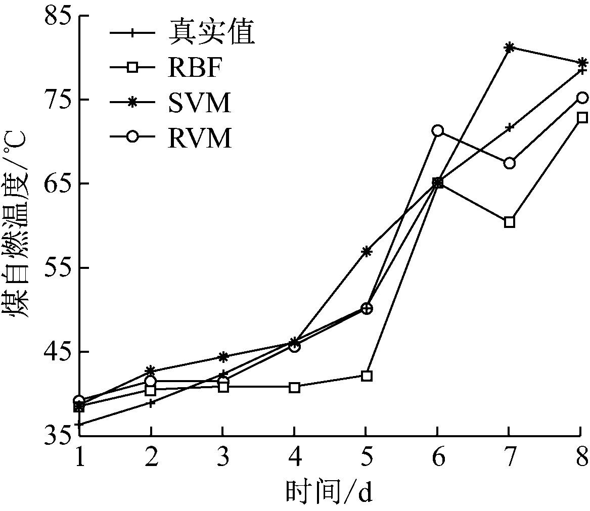 构建RBF神经网络、SVM、RVM 3种煤自燃预测模型。模型参数分别设置如下:RBF神经网络模型的扩展速度为371;SVM模型高斯核函数的核宽度为19,正则化系数为4 583;RVM模型核函数的核宽度为579。