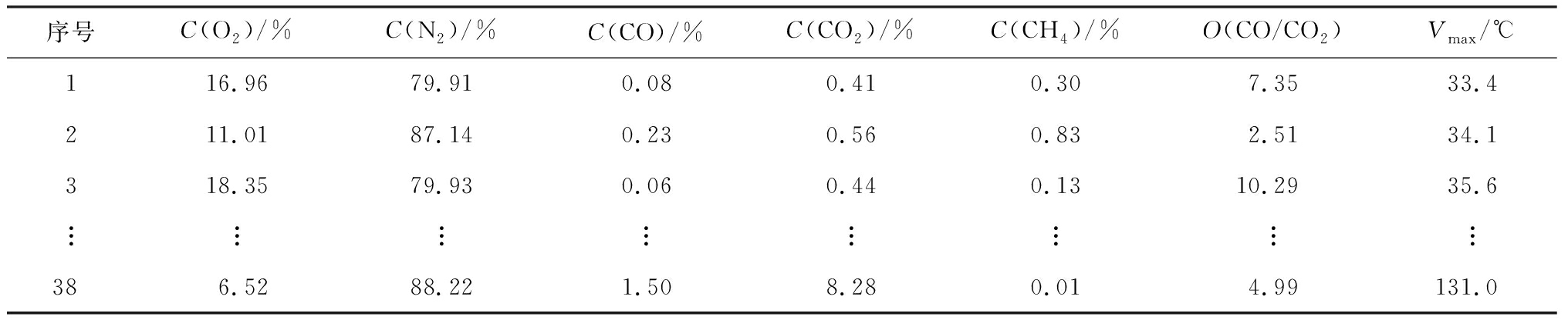 序号C(O2)/%C(N2)/%C(CO)/%C(CO2)/%C(CH4)/%O(CO/CO2)Vmax/℃116.9679.910.080.410.307.3533.4211.0187.140.230.560.832.5134.1318.3579.930.060.440.1310.2935.6︙︙︙︙︙︙︙︙386.5288.221.508.280.014.99131.0