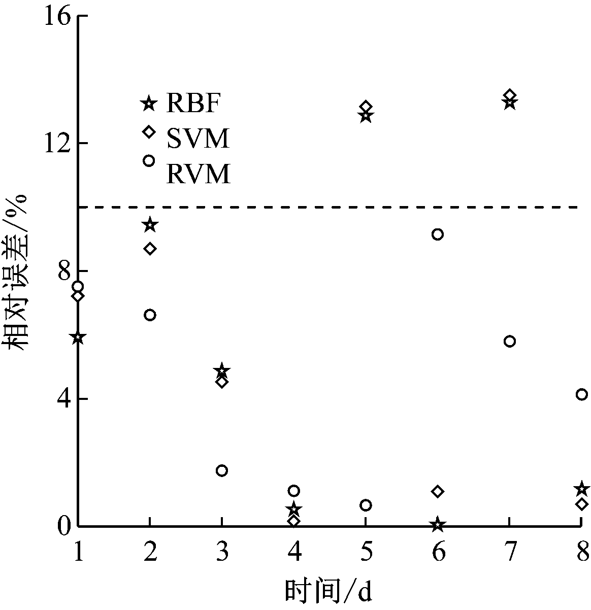 3种方法的相对误差如图5所示。3种方法的预测相对误差都在20%以内,基于RBF和SVM的煤自燃预测方法各有2个样本相对误差大于10%,基于RVM的煤自燃预测方法相对误差均小于10%,较为集中且相对较小。