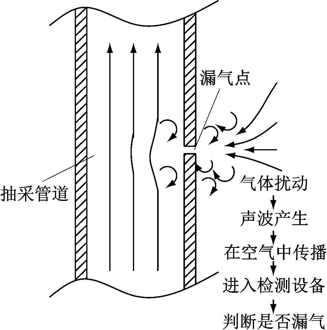 瓦斯抽采时,若管网某处存在漏气点,则巷道内空气在负压作用下进入管道中。因为漏气孔尺寸远小于管道及巷道的尺寸,且管道内外压差较大,所以漏气点附近流体出现旋涡、脉动等不稳定流动现象,而因此产生的部分能量以热量形式耗散在流体介质中,其余能量转化为声波形式在巷道中传播。漏气检测过程如下:气体扰动→声波产生→在空气中传播→进入检测设备→判断是否漏气,如图1所示。
