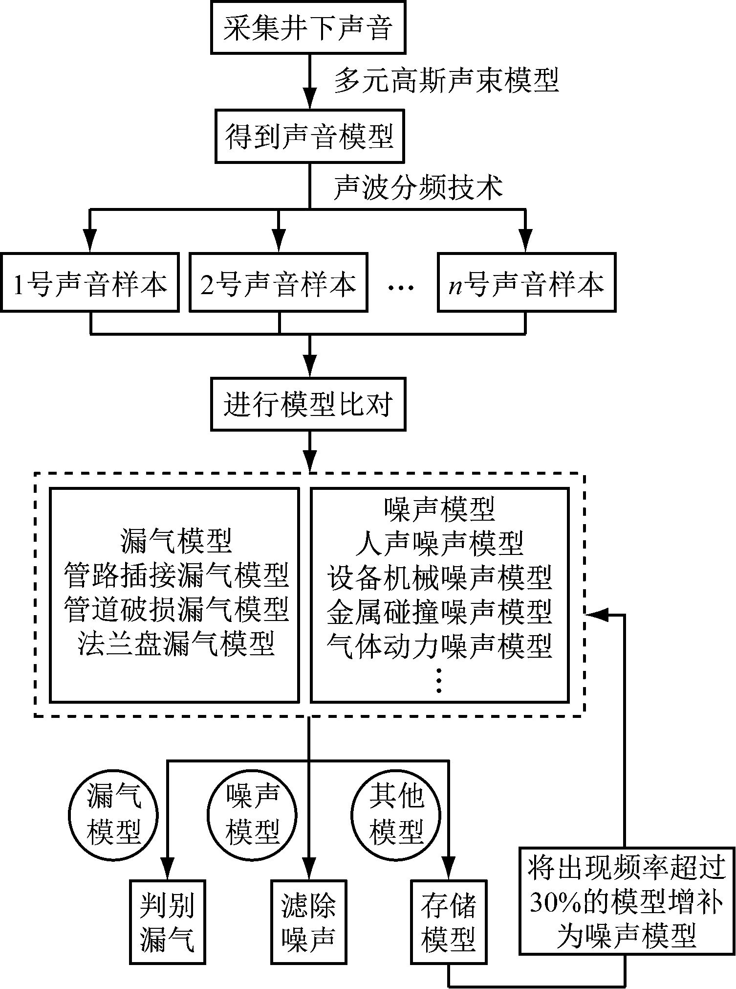 通过检测设备采集井下声音,用多元高斯声束对原始声音进行加强处理后形成清晰的声音模型,采用声波分频等技术进行处理,得到多个声音样本。将所得声音样本分别与预存的漏气模型和噪声模型进行比对,若与漏气模型匹配即可判断为漏气,发出声光报警信号,提示该检测点漏气。如果声音样本与漏气模型和噪声模型均不匹配,则存储该样本,并将出现频率超过30%的声音样本自动存储为噪声模型,以保证检漏技术在不同矿井环境下均有很高的准确率。自更新检漏技术流程如图3所示。