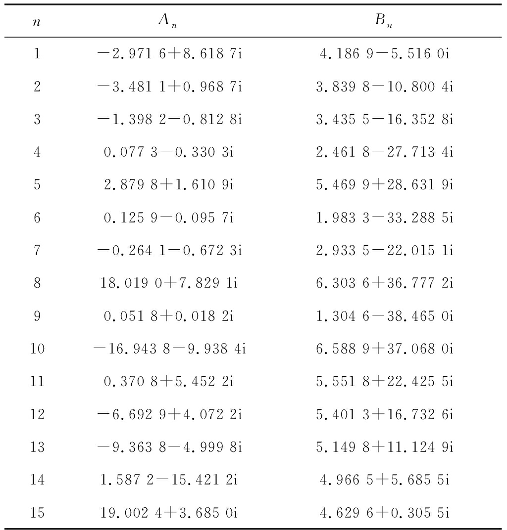 式中:ρ为传播介质密度,kg/m3;r为圆盘声源的半径,m;An,Bn为圆盘声源的Wen and Breazeale系数,具体取值见表1,其中i表示虚部。