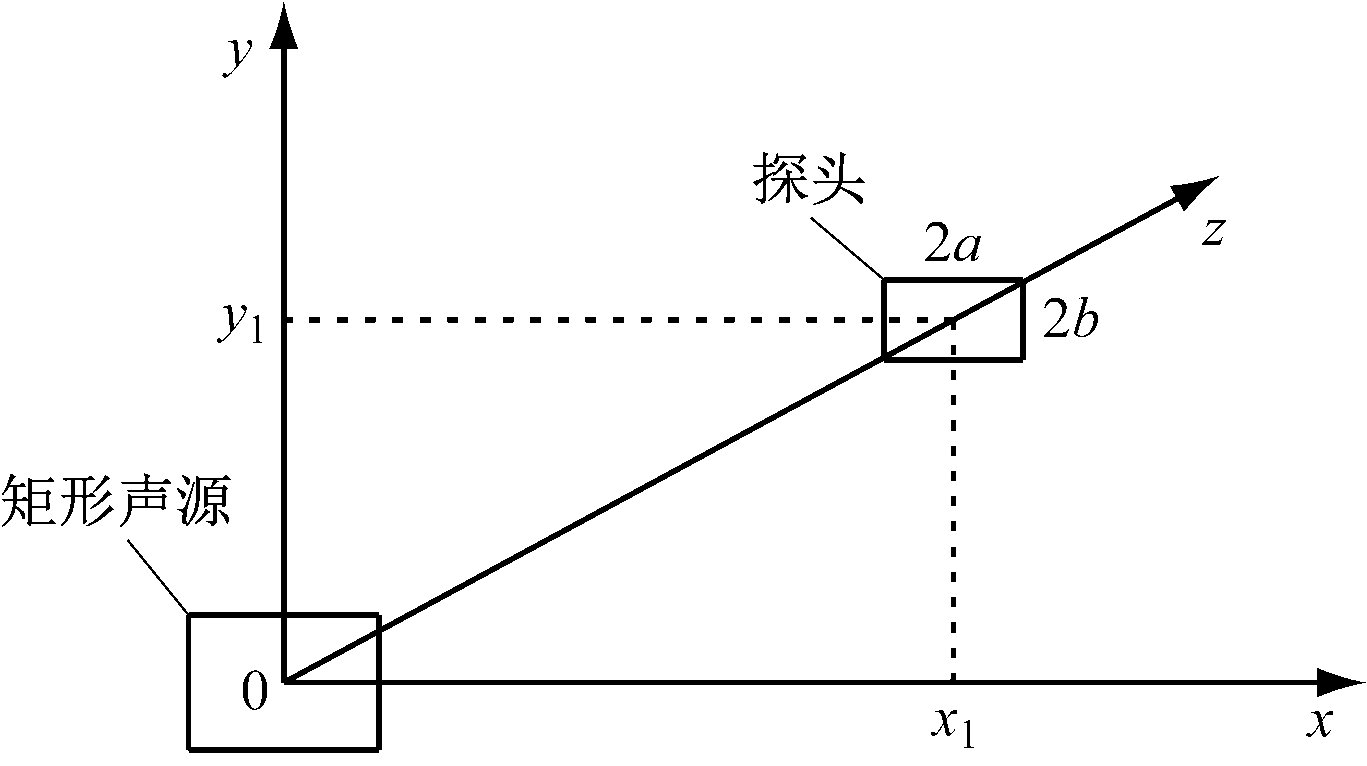 式中:x1和y1分别为探头中心位置在x,y坐标轴(分别平行于矩形声源的长边和短边)上的坐标(图4),m;a和b为矩形探头长和宽的1/2,m;Aq,Bq为矩形声源的Wen and Breazeale 系数,其值分别与An,Bn相同。