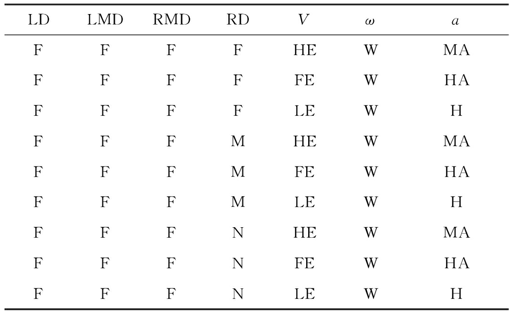 根据模糊控制避障算法中输入数据涉及的变量共得到3×3×3×3×3=243条模糊规则,其中,当左侧、左中及右中区域中障碍物距离较远时,部分控制规则见表1。