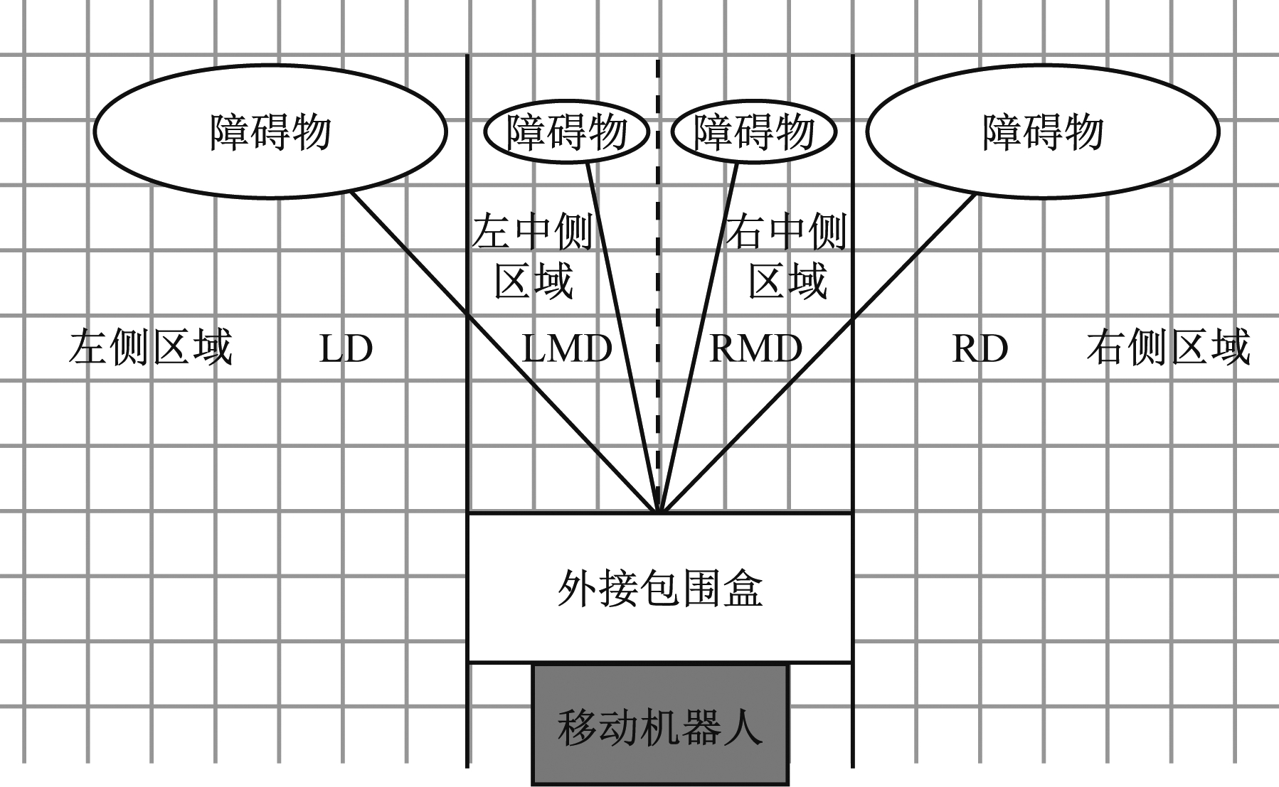 为了构建一个能够稳定运行并且能连续检测障碍物分布的控制策略,本文由双目立体视觉模组对井下环境进行实时感知,根据生成的三维点云构建占据栅格地图,将障碍物具体大小位置映射为二维占据栅格地图,将占据栅格地图以移动机器人为中心分为左(L),左中(LM),右中(RM)和右(R)4个障碍物区域,障碍物区域分布情况如图5所示,实时检测各区域中距离移动机器人最近的障碍物距离。