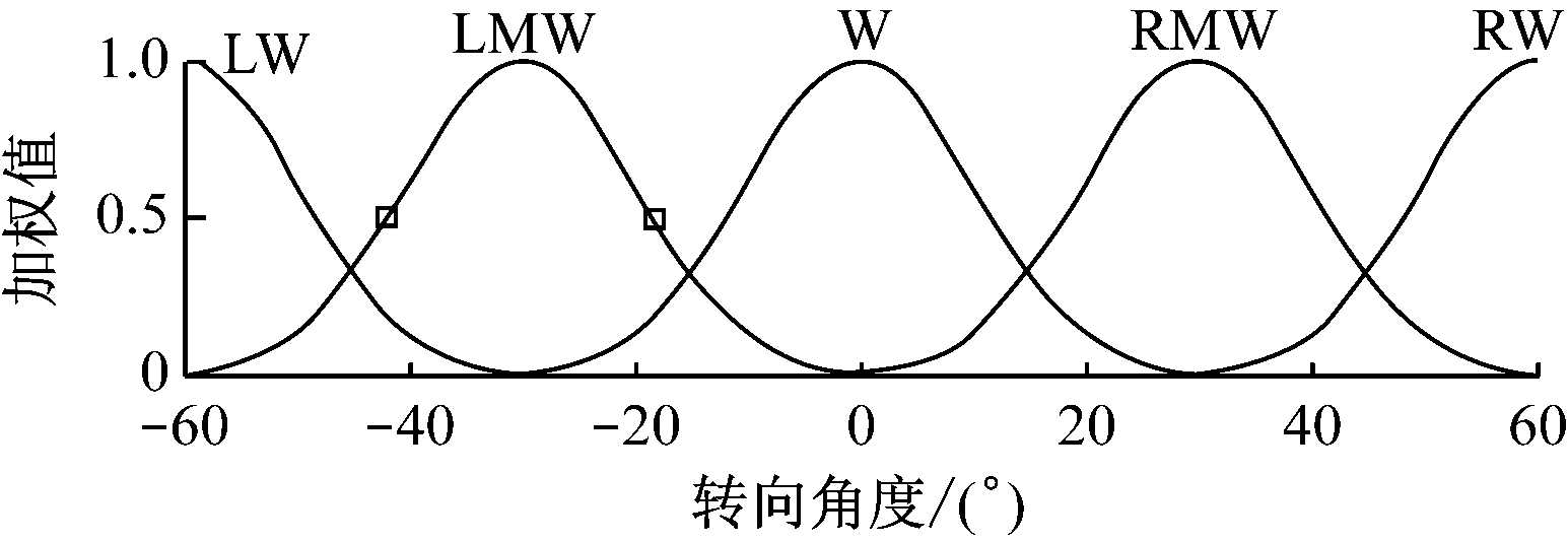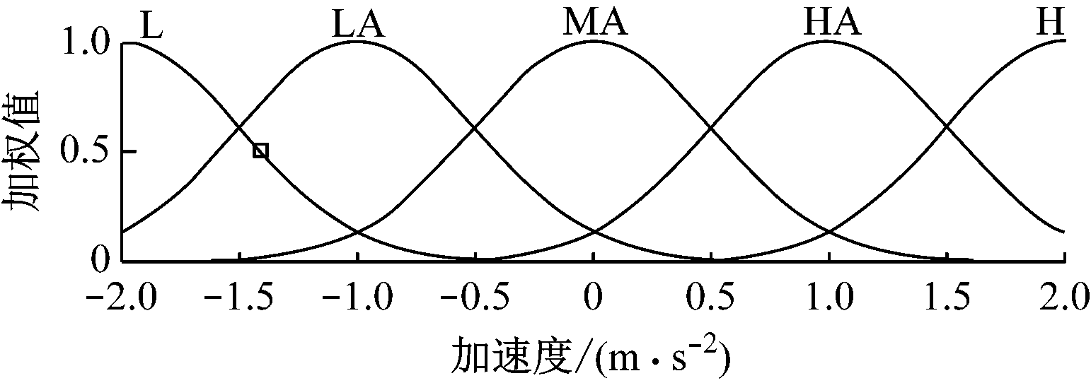 模糊控制算法的输出是下一时刻移动机器人的转向角度ω和加速度a,其中转向角度用模糊语言{LW,LMW,W,RMW,RW}分别表示左转、稍向左转、直行、稍向右转、右转,根据双目视觉模组所设计的120°视场角,将其论域设为[-60°,60°],如图9所示。加速度用模糊语言{L,LA,MA,HA,H}来表示减速、缓慢减速、不变、缓慢加速、加速,其论域的输出范围为[-2 m/s2,2 m/s2],如图10所示。