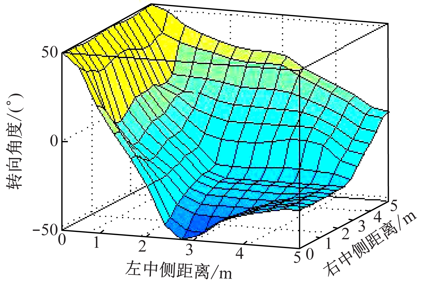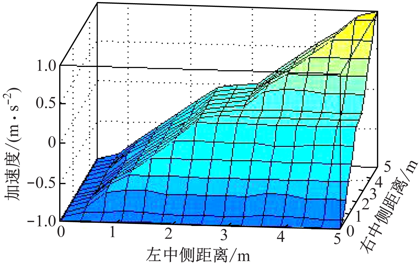根据模糊控制算法中的输入和输出变量,分别得到左中侧、右中侧障碍物分布对应的转向角度曲面和加速度曲面,如图11、图12所示。从图11、图12可看出,对应各区域障碍物分布,转向角度和加速度能够较为平滑地进行过渡,证明了该控制策略的稳定性。