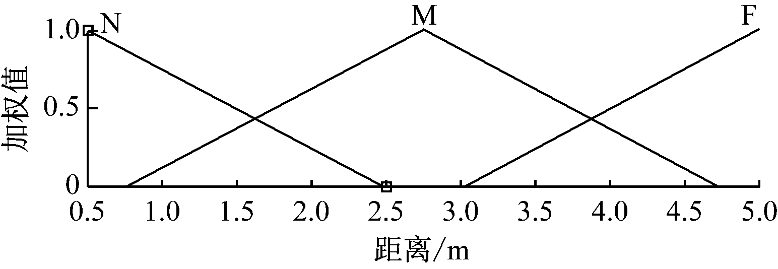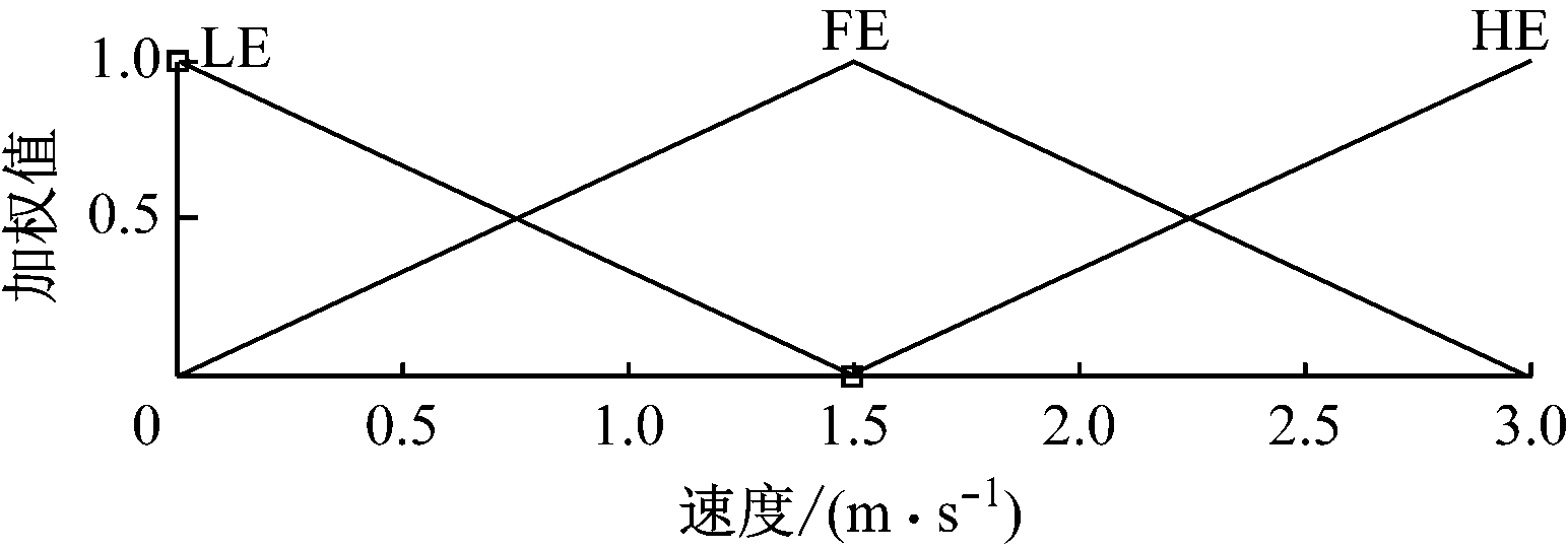 利用模糊控制语言LD,LMD,RMD,RD表示左、左中、右中、右4个区域中障碍物距离,对于模糊控制器输入的距离信息{LD,LMD,RMD,RD},使用{F,M,N}3个模糊语言来表示远、中、近,根据井下环境及经验设置障碍物距离探测的论域范围为[0.5 m,5 m],若检测距离大于5 m,则记为5 m,如图7所示。对于速度V,使用{LE,FE,HE}分别表示慢速、中速、快速,其论域范围为[0,3 m/s],如图8所示。