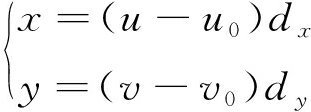 式中:u,v为图像像素坐标点;u0,v0为图像坐标原点;dx,dy为x,y方向的像元大小。