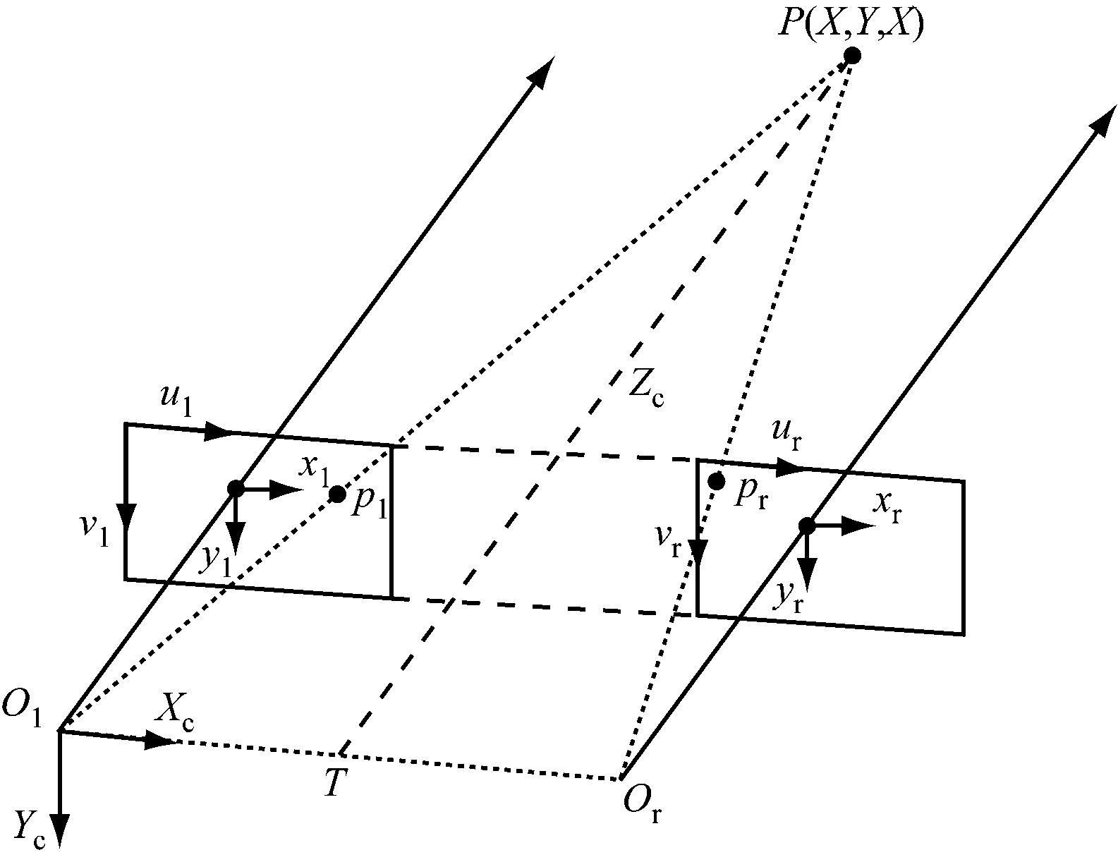 在双目立体视觉模型中,将左相机光心作为空间坐标原点,左右相机像面以左上角为原点建立图像像素坐标系(其中变量下标l表示左侧相机,r表示右侧相机),分别为ul-vl,ur-vr。物理坐标系以左右像面的中心点为原点:xl-yl,xr-yr;2个相机的光心点为Ol,Or;pl(ul0,vl0),pr(ur0,vr0)为光轴与像平面的交点。T为左右相机光心的距离,称为基线距。在建立的双目立体视觉模型中,空间中任意一点P(X,Y,Z)的坐标计算公式如下: