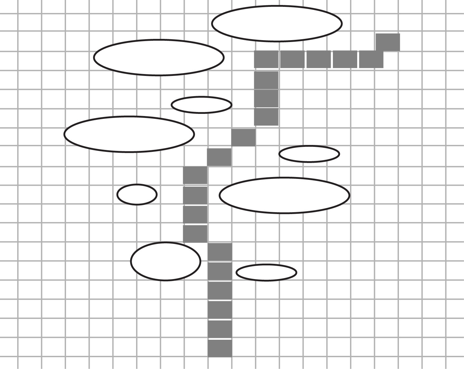 通过Matlab设计仿真实验,随机设置模拟障碍物分布情况。移动机器人智能避障仿真实验如图13所示,白色椭圆区域为障碍物区域,灰色方格为移动机器人沿途躲避随机生成的障碍物而形成的运动轨迹。利用模糊控制规则实时将移动机器人检测到的障碍物信息(图中白色区域)作为模糊控制的输入,进而得到移动机器人的运行速度和转向角度,从而生成移动机器人的行走路径。