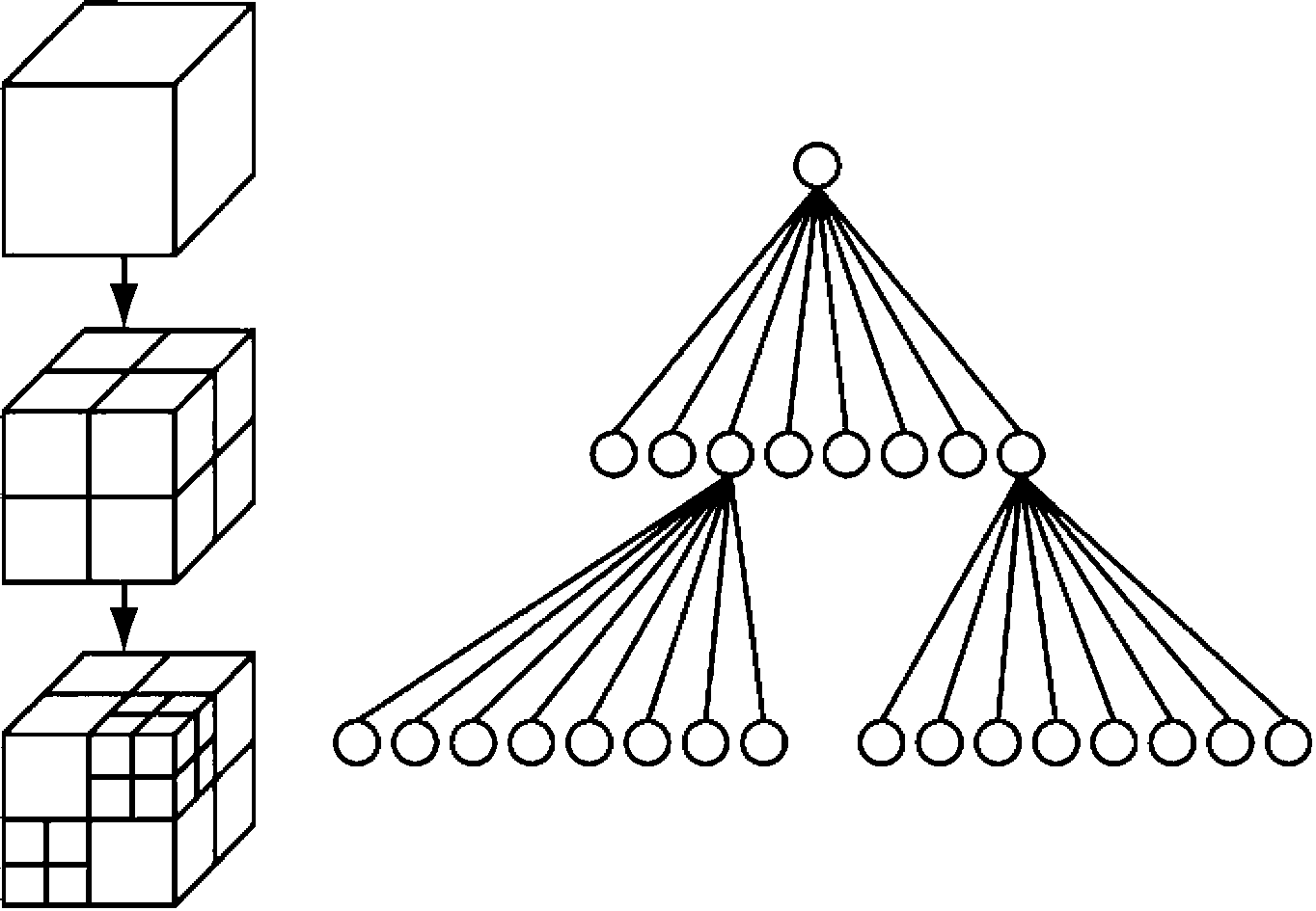 八叉树结构模型如图2所示。新建八叉树时,首先要设置最大递归深度为当前点云的分辨率,然后从中心节点出发向下扩张,每次分为8个子节点,直到扩张到叶子节点,即最大递归深度时不再向下扩张分解。