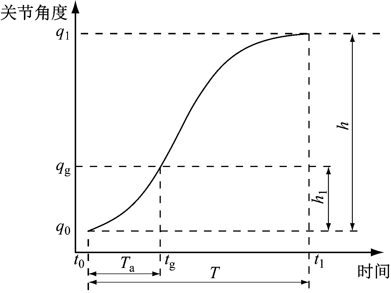 抛物线轨迹也被称为重力轨迹或加速度恒定轨迹,拐点不对称的抛物线轨迹如图5所示。其中,q0,qg,q1分别为起始点、中间点及终止点的关节角度;t0,tg,t1为与q0,qg,q1相对应的时间;Ta为加速段的时间;T为整个运动过程的时间;h1和h分别为加速段和整个运动过程的关节角度变化量。