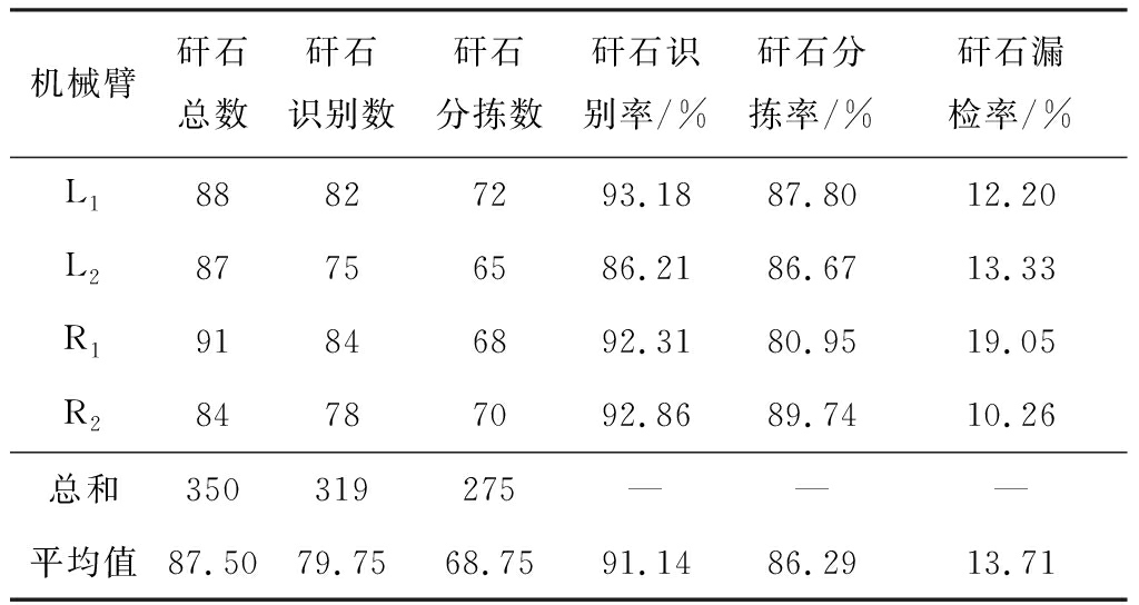 机械臂矸石总数矸石识别数矸石分拣数矸石识别率/%矸石分拣率/%矸石漏检率/%L188827293.1887.8012.20L287756586.2186.6713.33R191846892.3180.9519.05R284787092.8689.7410.26总和350319275———平均值87.5079.7568.7591.1486.2913.71