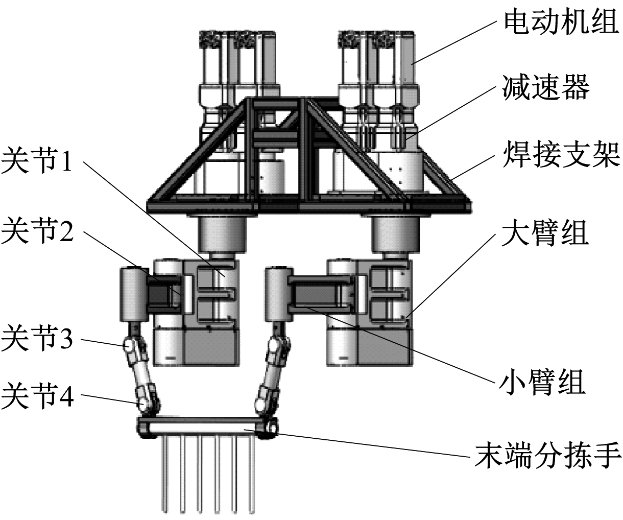 并联机器人具备动态响应快、精度高及自身负荷小等优点,自问世以来便成为机器人领域的研究热点[10]。SCARA型机器人具有结构简单、运动速度快、定位精度高等特点,常用于工业生产领域。本文将2种机器人的优点相结合,采用双臂并联SCARA型机器人作为分拣机械臂。该机器人采用模块化设计思想和对称式结构,通过SolidWorks进行三维设计。其主要由焊接支架、电动机组、减速器、大臂组、小臂组及末端分拣手等组成,如图2所示。该机器人具有4个自由度,每条手臂分别有2个转动关节,末端执行机构能够实现平移和转动。