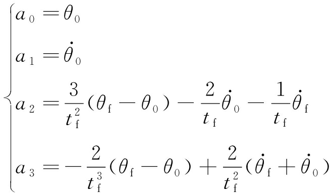 分拣机器人末端执行机构运动轨迹曲线可用1个以起始关节角度θ0和终止关节角度θf为参考变量的函数θ(t)来描述。为了获得平滑的运动轨迹,需对θ(t)施加以下约束条件: