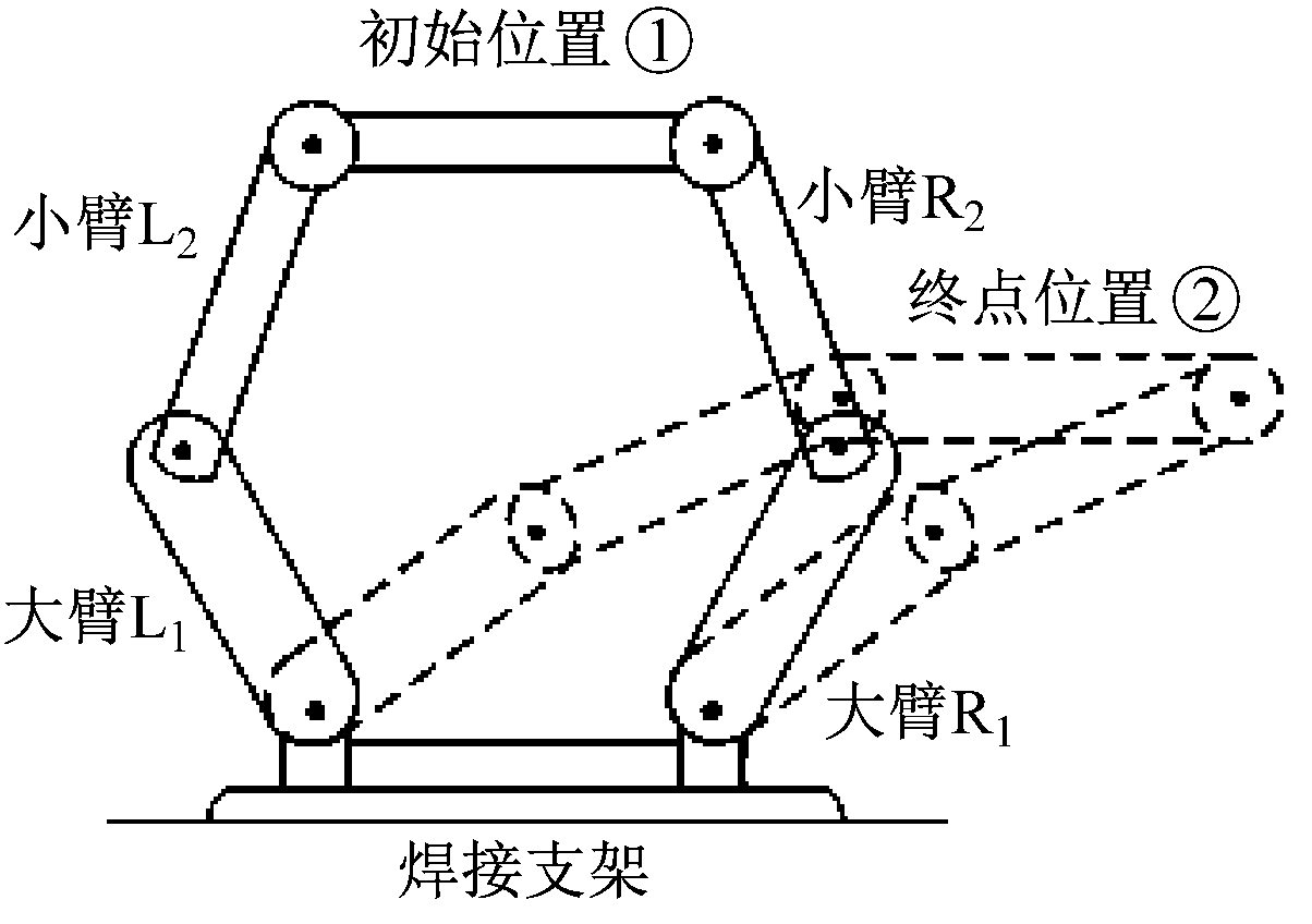 以辅助带式输送机位于分拣机器人右侧为例对分拣过程进行阐述。机器人分拣动作俯视图如图4所示,实线为机器人的初始位置①,虚线为机器人的终点位置②。当接收到来自视觉系统的分拣信号时,机器人左右臂同步运动到右侧终点位置②;然后左侧机械臂先回程,从而使分拣手的竖直高度提升,避免回程时与矸石发生碰撞;当其运动到行程的60%时(分拣手高度约为350 mm),通过全局变量向右侧机械臂发送信号,右侧机械臂收到信号后开始回程;当左右机械臂都回到初始位置①时,彼此向对方发送回零信号,左右臂动作再次同步。