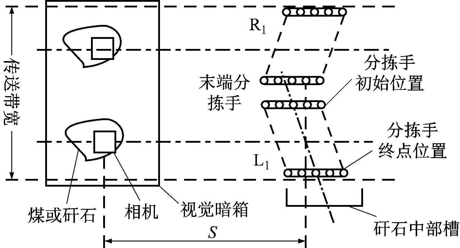 煤矸石识别及分拣原理如图3所示,其中L1,R1分别为左右侧大臂。机器人末端分拣手顺着主带式输送机运动的方向推动矸石,利用矸石运动的惯性与分拣手的推力,将矸石斜向推入辅助带式输送机(实际为矸石中部槽)上。相机与机器人初始位置间的距离S是固定的,辅助带式输送机与机器人的相对位置也是固定的,且带式输送机运行速度不变,故可以设定每次分拣动作到达的终点位置及分拣速度均相同。视觉部分给控制器发送信号的时间间隔等于矸石从相机视野中心被识别定位后运动到分拣机器人初始位置的时间加上视觉系统与控制器的通信时间。