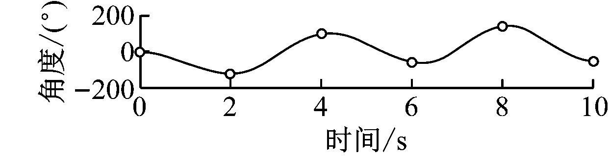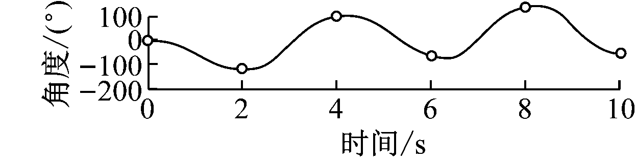 以分拣机器人左臂关节1为例,在Matlab中对多路径点三次多项式进行轨迹规划仿真,设其在0,2,4,6,8,10 s时,依次经过关节角0,-120,100,-60,140,-50°,各路径点角速度分别为0,-10,30,-65,40,0 °/s,仿真结果如图7所示。