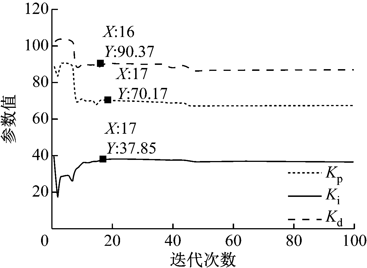 由图6可知,PSO在迭代17次左右即获得全局最优值Gbest,此时粒子位置属性便可赋值给Kp,Ki,Kd,完成参数整定过程。由图7可知,算法优化过程中,性能指标ITAE不断减小,在迭代17次后,系统误差指标ITAE最终稳定于1.103。