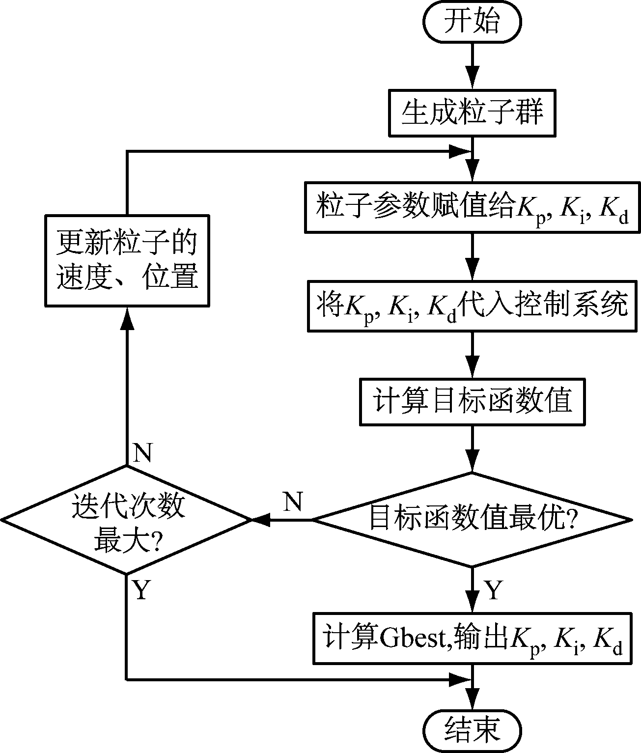 粒子的维度可以任意设置,因为PID控制需要优化的仅仅是3个控制参数(Kp,Ki,Kd ),所以,可令PSO产生一组三维粒子群,经过迭代进化后,粒子群全局极值满足适应度函数要求时,将粒子位置矢量分别赋值给Kp,Ki,Kd三个参数,据此,粒子群寻优过程便与PID控制器参数整定的过程相统一。PSO优化PID参数流程如图4所示。