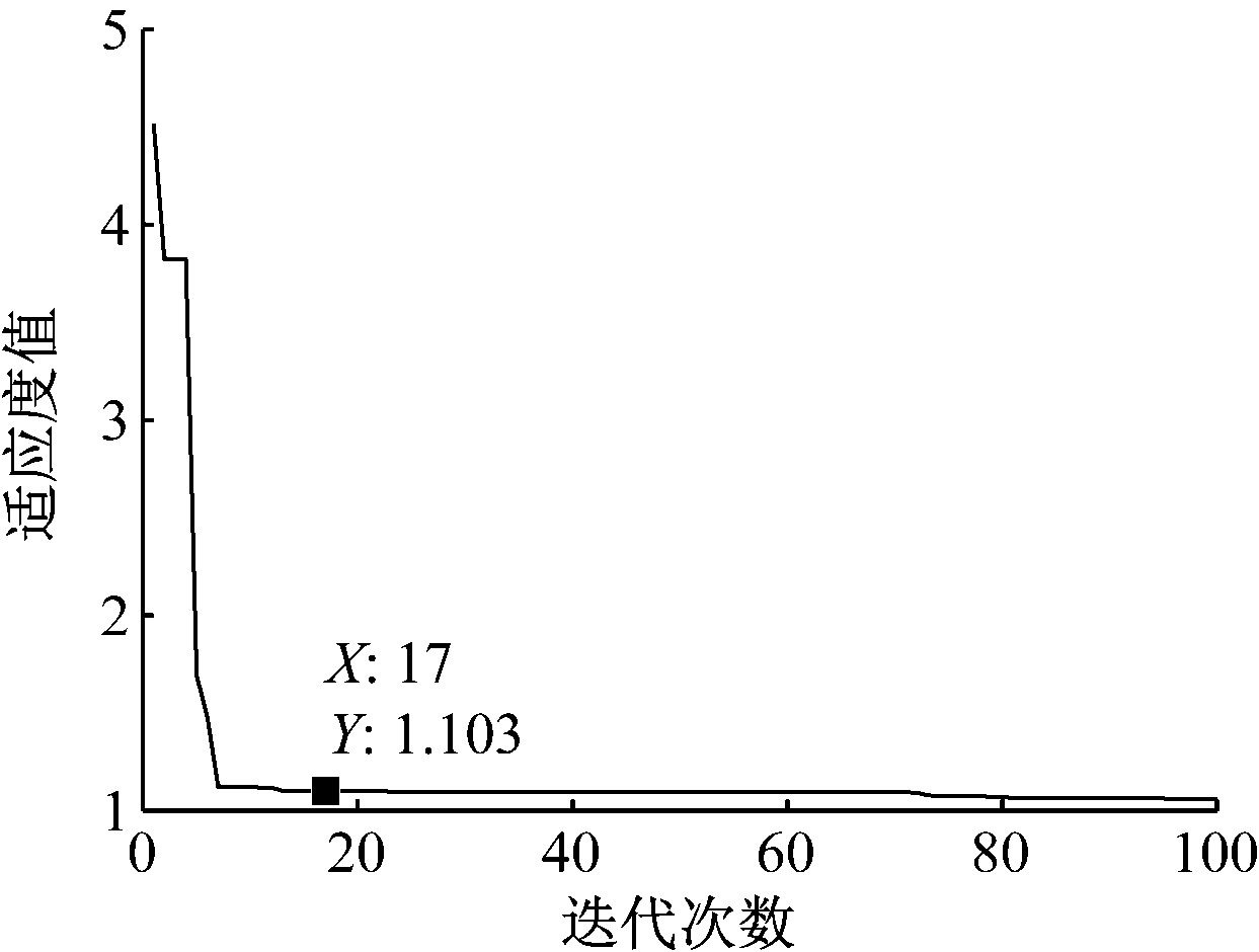 常用的误差性能指标包括误差平方积分(ISE)、误差绝对值积分(IAE)和时间乘误差绝对值积分(ITAE)等[12-15],ISE是对误差e(t)平方积分,因为其收敛速度快,易造成控制输出超调量增大;IAE是对误差e(t)绝对值积分,ITAE是对时间t和误差绝对值乘积积分,IAE和ITAE相比ISE都克服了控制输出易超调的缺陷,但同时ITAE因为加入了时间环节,其收敛速度优于IAE。因此,本文选用ITAE指标来构建适应度函数。定义适应度函数为