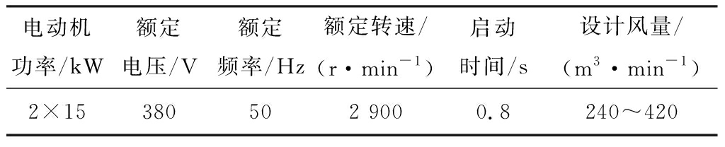 电动机功率/kW额定电压/V额定频率/Hz额定转速/(r·min-1)启动时间/s设计风量/(m3·min-1)2×15380502 9000.8240~420