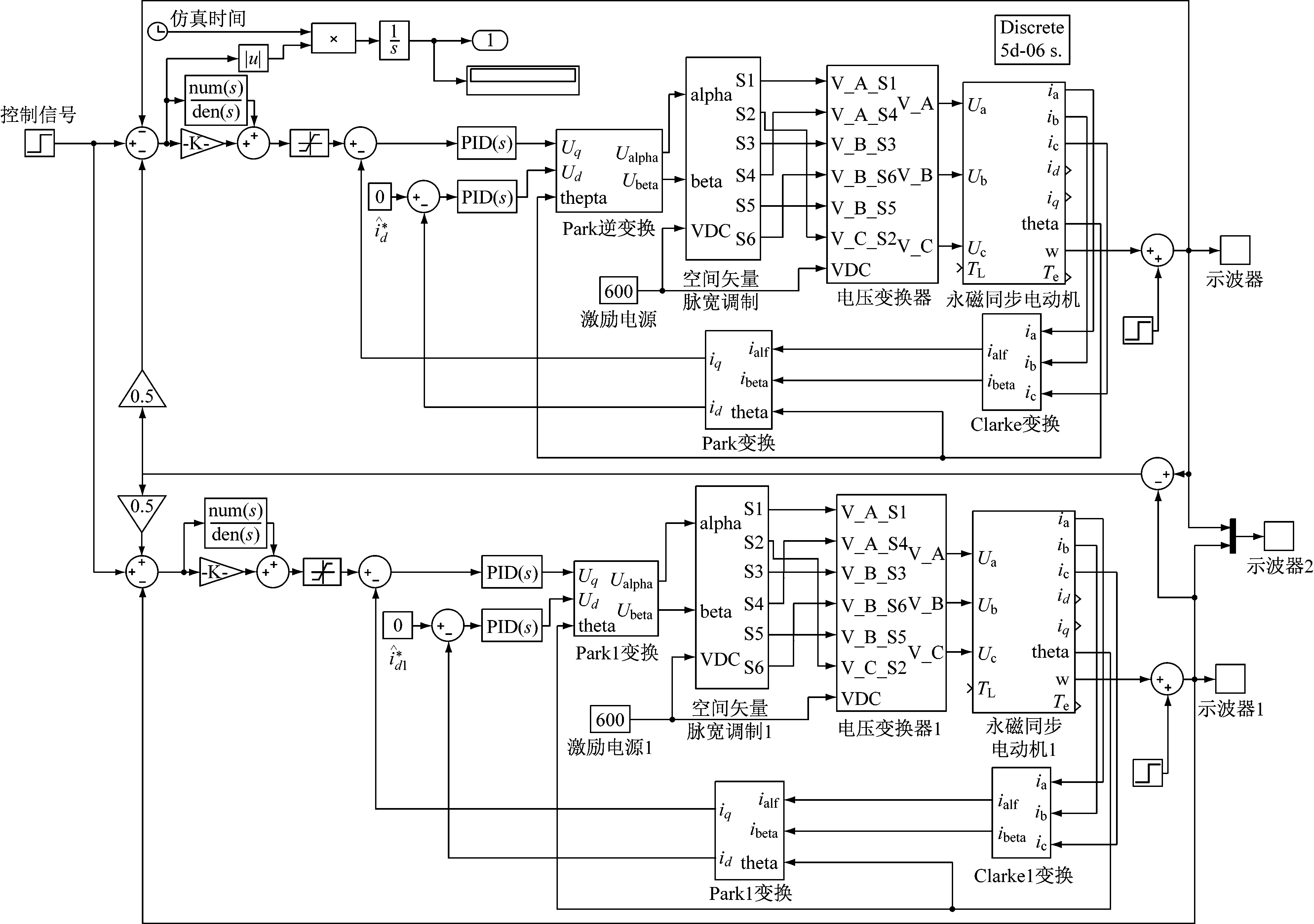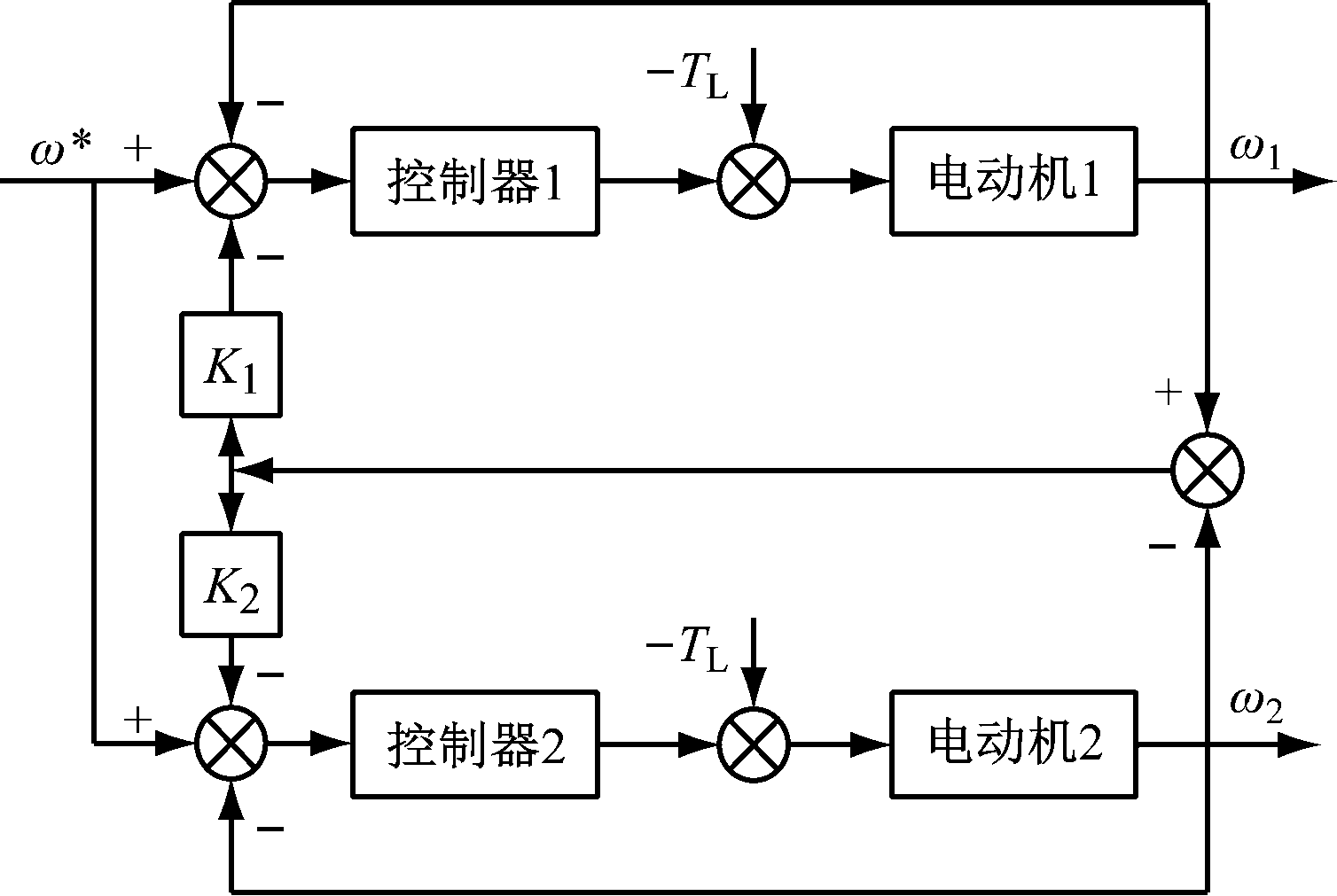 本文采用交叉耦合控制实现双永磁同步电动机运行控制。交叉耦合控制策略[10]:通过速度传感器测出2台电动机的实时转速并作差,差值信号通过2台电动机相对应的权重系数形成联动反馈信号;当一台电动机出现扰动时,另外一台电动机能够及时根据扰动进行调整。通过交叉耦合控制策略可获得稳定的同步控制精度,有效提高抗干扰性能。