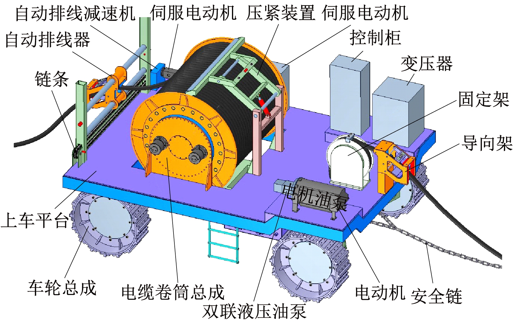 电缆卷放车机械构造如图1所示。排线电动机与卷筒电动机选用永磁同步电动机,置于卷放车车体的左后方。排线电动机与卷筒电动机的转速保持一致,排线电动机通过排线减速机带动链条工作。自动收放装置由立柱、限位传感器、导杆、链条、上下滚架、排线器、减速机、伺服电动机、控制器等部件组成,可实现电缆自动排放,还可根据电缆的松紧度自动收放电缆。
