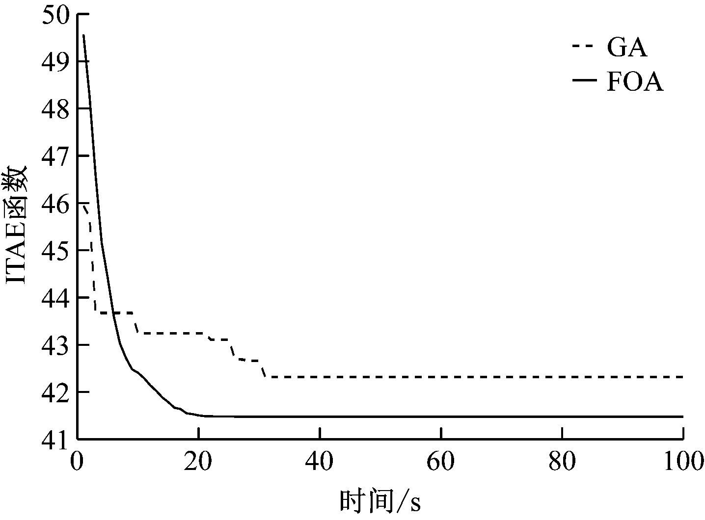 为验证FOA-PI算法的有效性和优越性,用该算法和遗传算法(Genetic Algorithm,GA)进行PI参数寻优计算,并对两者性能进行对比。选取文献[14]中的电动机作为被控对象,其传递函数如式(12)所示。在Matlab中搭建PID控制仿真模型,分别用GA和FOA优化PID控制器参数,将ITAE函数作为控制器性能评价指标,优化结果如图5所示。