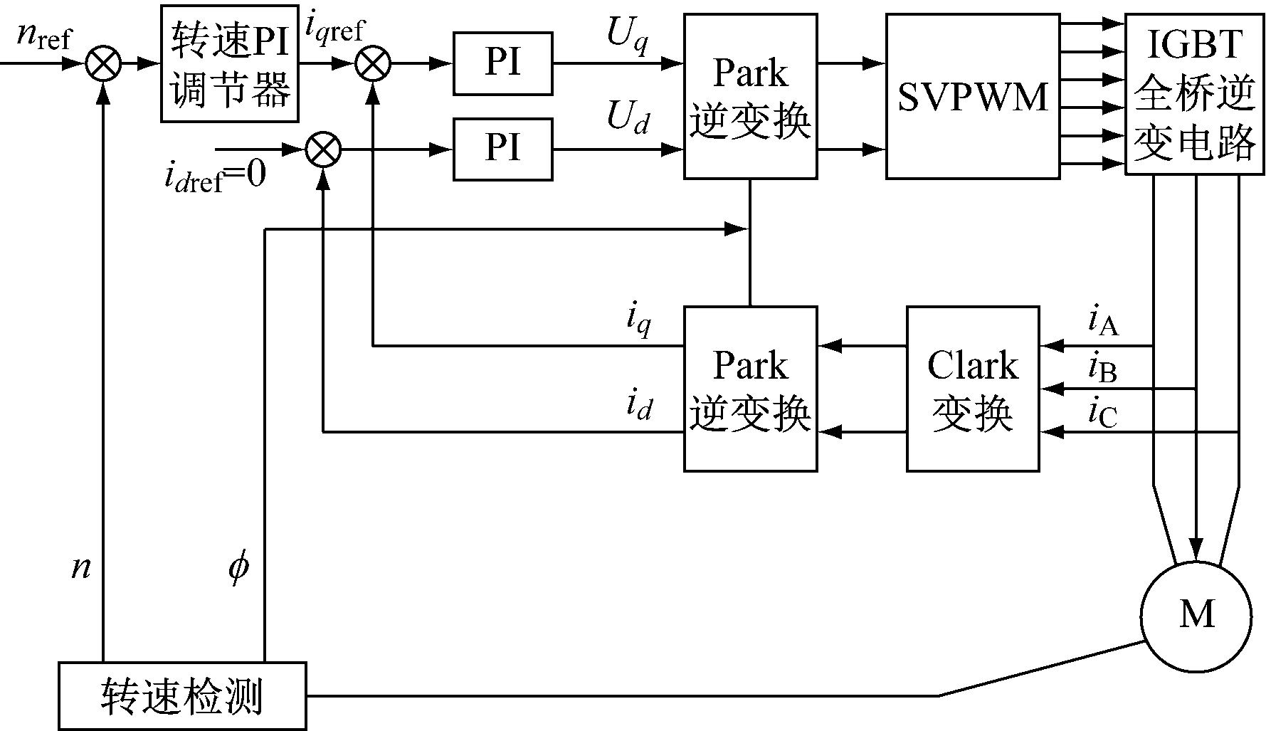 单个永磁同步电动机矢量控制原理如图3所示。采用双环控制模式,以电流环作为内环,速度环作为外环,nref为期望转速,n为电动机转速,对两者的偏差值进行PI整定,得到iq的参考电流iqref,将其作为电流环的输入,同时令idref=0,通过Park逆变换后进行空间矢量脉宽调制(Space Vector Pulse Width Modulation,SVPWM),产生PWM波驱动三相逆变器,进而驱动电动机。