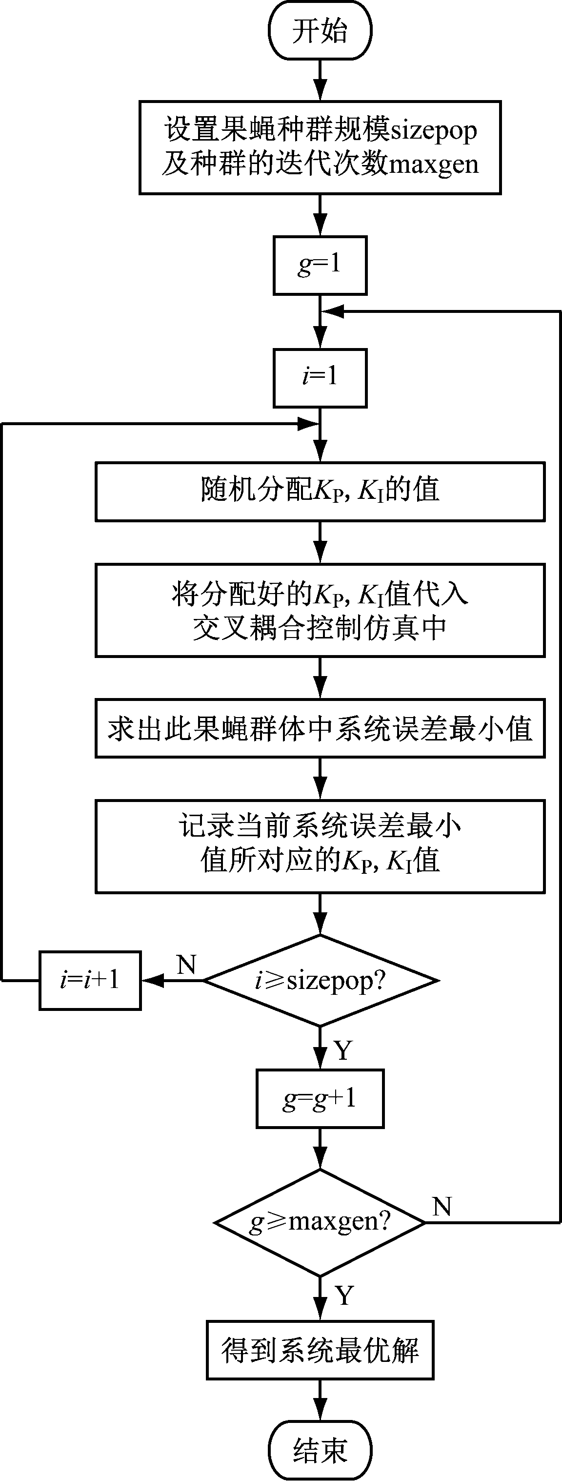 FOA-PI算法寻优步骤如下:① 设置果蝇种群规模sizepop和最大迭代次数maxgen。② 随机生成果蝇群的初始位置KP1,KI1,进行初始化。③ 随机分配KP,KI的值:KPi=KP1+2×rand()-1,KIi=KI1+2×rand()-1,其中i=1~sizepop。④ 将KP,KI值代入交叉耦合控制模型中,求出该果蝇个体所对应的控制误差值JITAE。⑤ 求果蝇群体搜寻到的最优值,即对应的误差最小值。⑥ 记录误差最小值所对应的KP,KI的取值。⑦ 重复执行步骤④—步骤⑥,进入迭代寻优,并判断当前误差最小值是否小于所保存的最小值,如果是则执行步骤⑥。迭代完成时,结束算法优化过程。