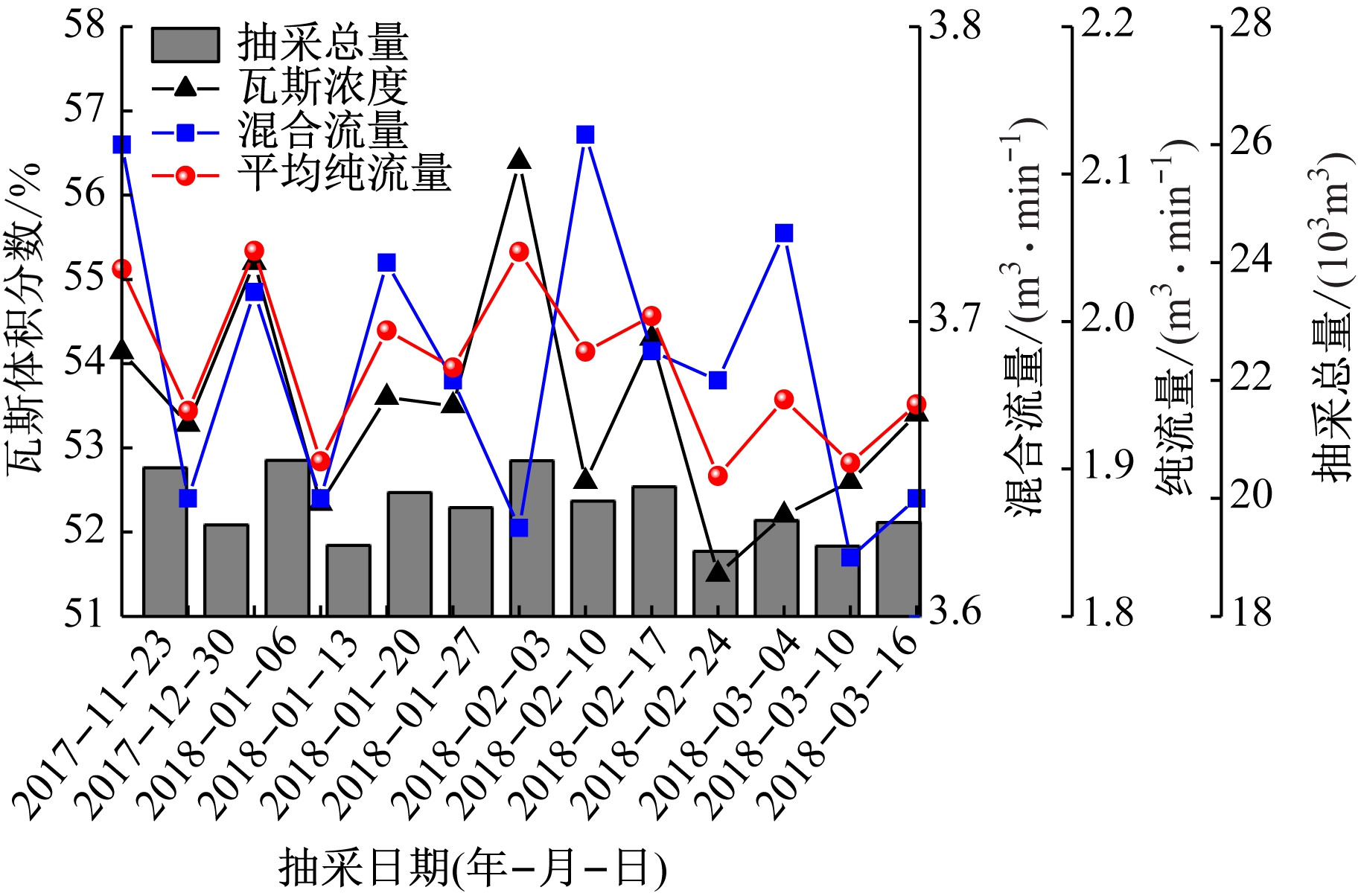 将数值模拟中布孔方案应用于现场实际抽采工作,抽采效果如图9所示。可看出各监测时段的瓦斯抽采总量较稳定,平均值为19.86×103 m3;瓦斯抽采体积分数和混合流量的变化范围分别为51.5%~56.4%,3.62~3.76 m3/min,瓦斯抽采体积分数平均值为53.5%,混合流量平均值为3.68 m3/min;瓦斯抽采纯流量在抽采前期波动幅度较大,抽采中期较为稳定,抽采后期有所下降,纯流量平均值为1.97 m3/min。