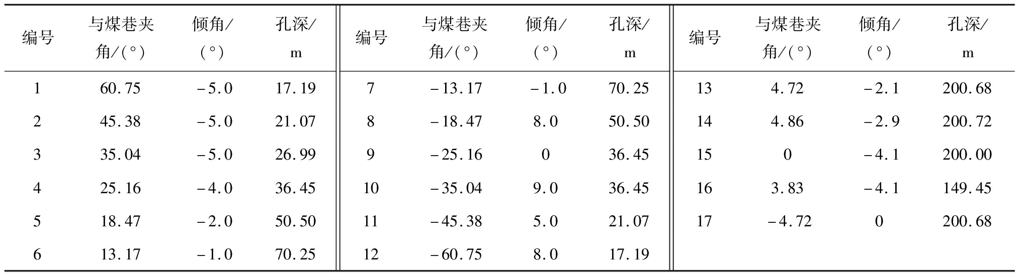 编号与煤巷夹角/(°)倾角/(°)孔深/m编号与煤巷夹角/(°)倾角/(°)孔深/m编号与煤巷夹角/(°)倾角/(°)孔深/m160.75-5.017.197-13.17-1.070.25134.72-2.1200.68245.38-5.021.078-18.478.050.50144.86-2.9200.72335.04-5.026.999-25.16036.45150-4.1200.00425.16-4.036.4510-35.049.036.45163.83-4.1149.45518.47-2.050.5011-45.385.021.0717-4.720200.68613.17-1.070.2512-60.758.017.19