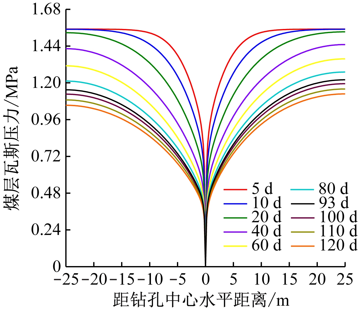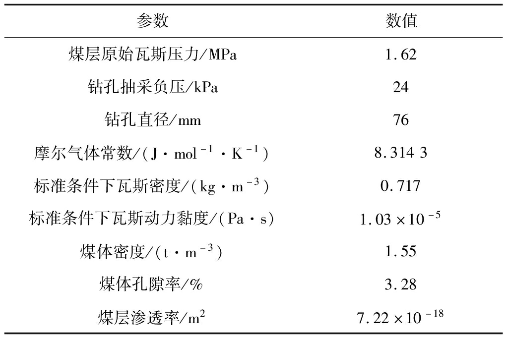 参数数值煤层原始瓦斯压力/MPa1.62钻孔抽采负压/kPa24钻孔直径/mm76摩尔气体常数/(J·mol-1·K-1)8.3143标准条件下瓦斯密度/(kg·m-3)0.717标准条件下瓦斯动力黏度/(Pa·s)1.03×10-5煤体密度/(t·m-3)1.55煤体孔隙率/%3.28煤层渗透率/m27.22×10-18