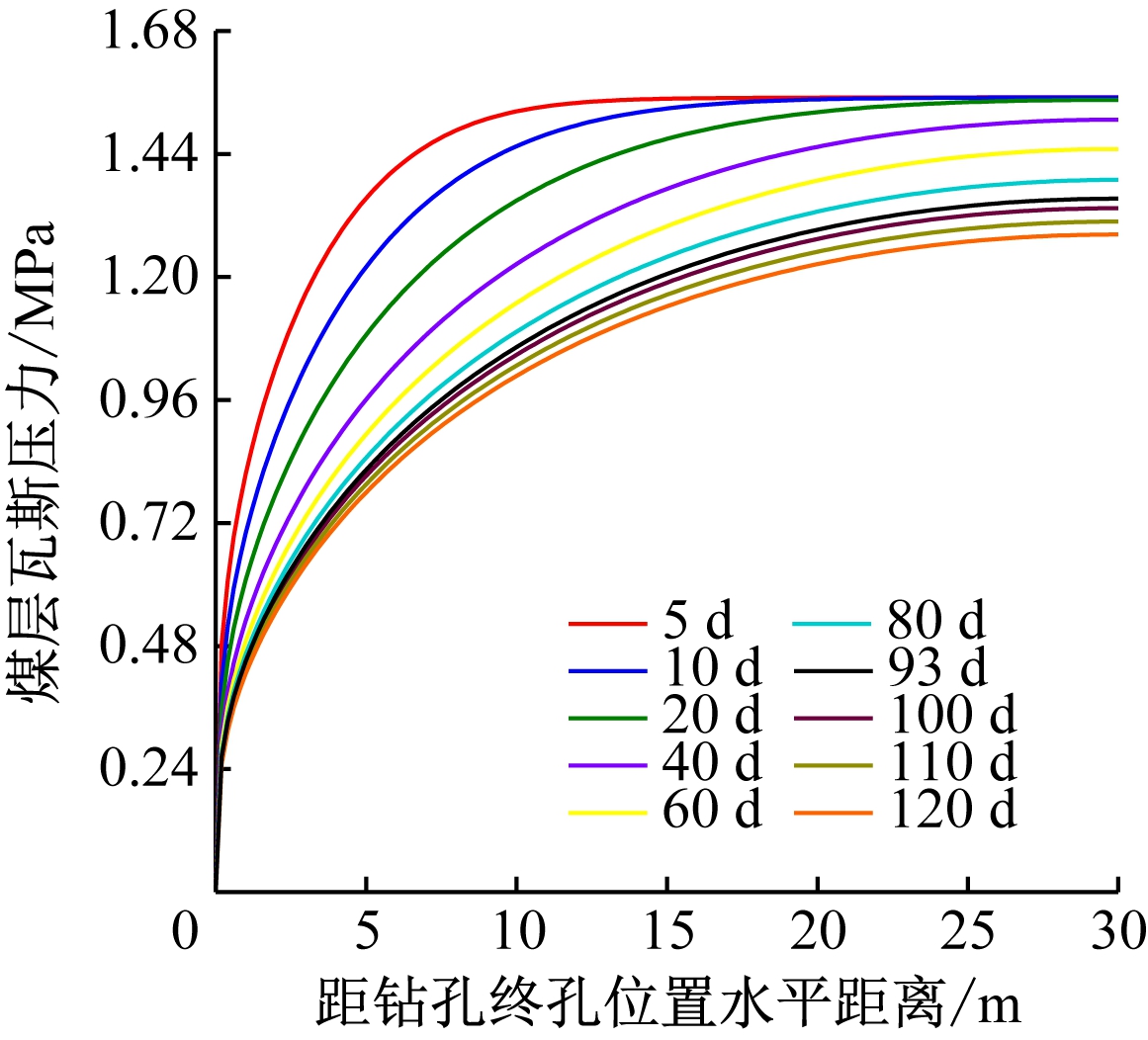 图4 不同抽采时间下钻孔径向瓦斯压力分布