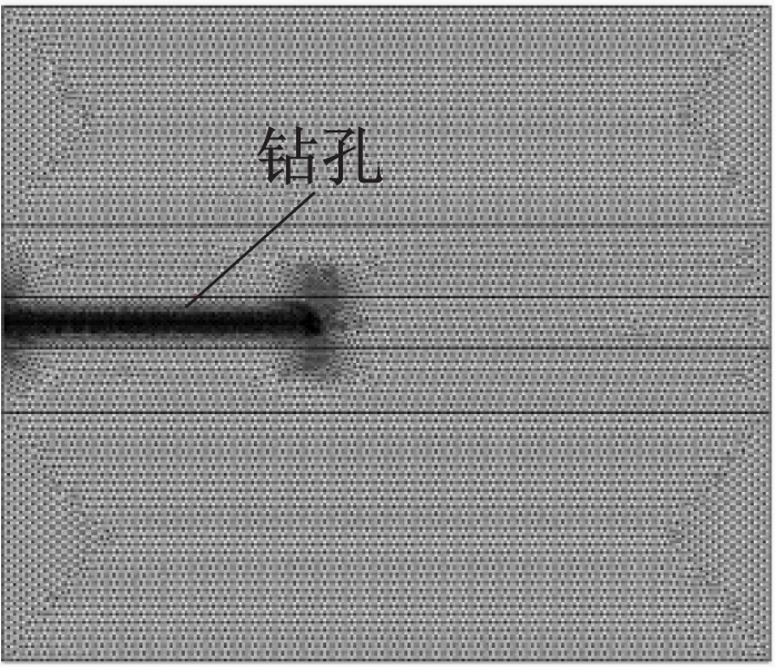 模型边界条件:煤层边界瓦斯压力恒为1.62 MPa;钻孔抽采负压恒为24 kPa。采用自由三角形进行网格划分,并对钻孔周围的网格做加密处理,如图2所示。