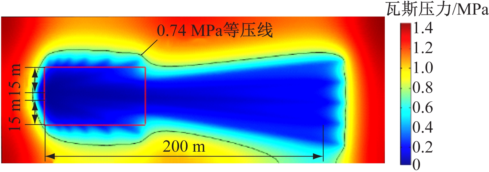 预抽93 d时掘进工作面煤层瓦斯压力分布云图如图8所示。可看出煤巷两帮15 m范围内瓦斯压力均降至0.74 MPa以下,且煤巷两帮抽采达标范围远大于预期;掘进工作面前方200 m范围内瓦斯压力也降至0.74 MPa以下,预抽效果较好。