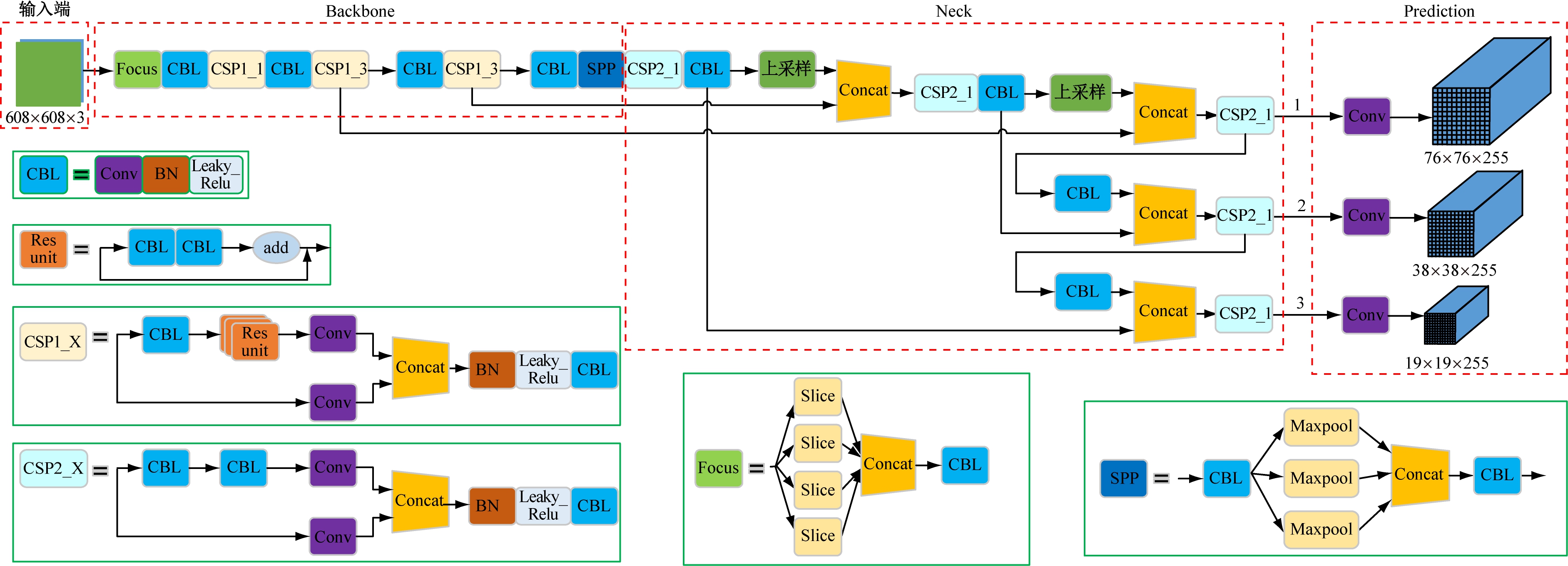 YOLOv5s模型在YOLOv4模型的基础上,主要实现了对模型大小和性能的灵活配置,同时引入最新的网络模块和训练技巧,如马赛克数据增强、DropBlock机制、Hardswish激活函数、GIoU边界框回归损失等。YOLOv5s模型主要由输入、Backbone、Neck、Prediction等区域组成,每个区域由CBL(Conv+BN+Leaky_Relu)、CSP(CBL+Res unit+Concat+BN+Leaky_Relu)、Focus、SPP等模块构成,如图2所示。