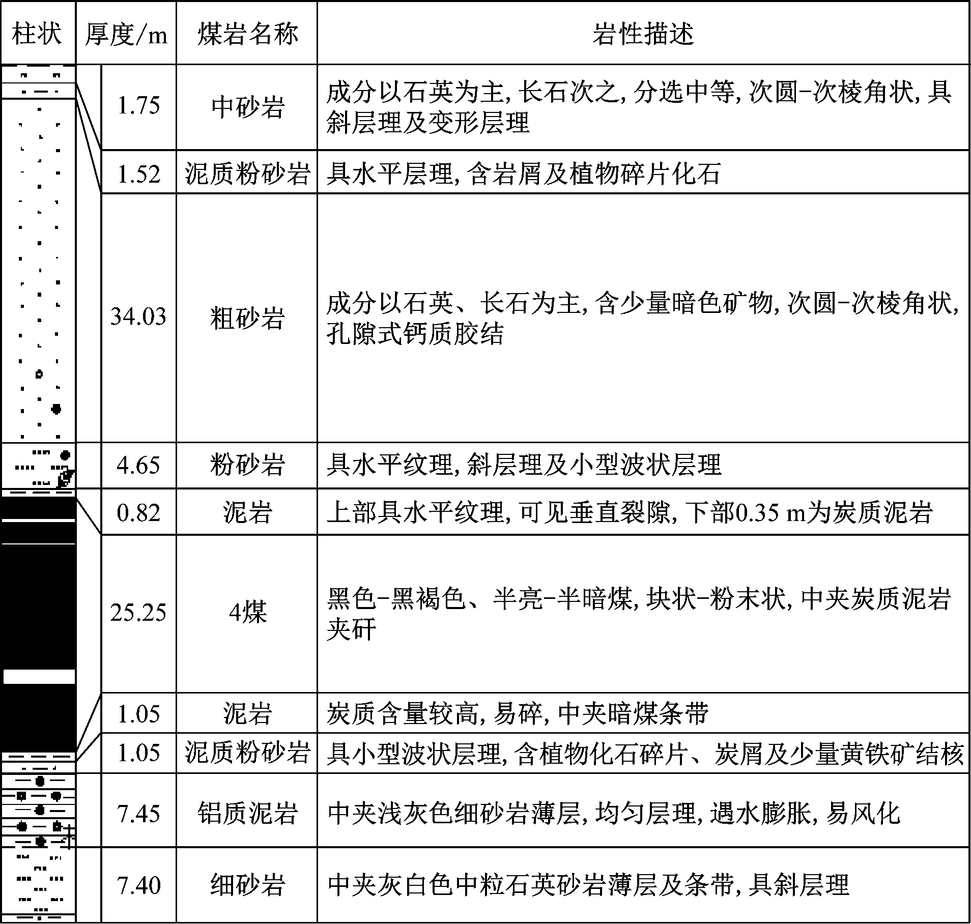 40309工作面设计开采4煤层,煤层厚度为19~28 m,倾角为0~5°,埋深为531~731 m。直接顶为粉砂岩、细砂岩、薄层泥岩,稳定性较差,厚度为3~9 m;基本顶为粗砂岩,厚度为10~34 m,单轴抗压强度为58.3 MPa,属中等稳定性岩体;底板为铝质泥岩、泥质粉砂岩、泥岩,遇水易膨胀,稳定性较差,厚度为7~10 m。40309工作面顶底板岩层柱状图如图2所示。