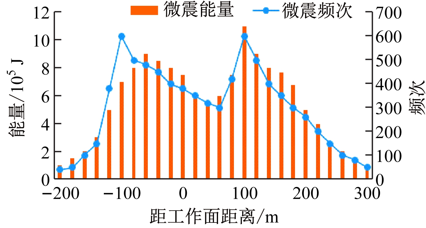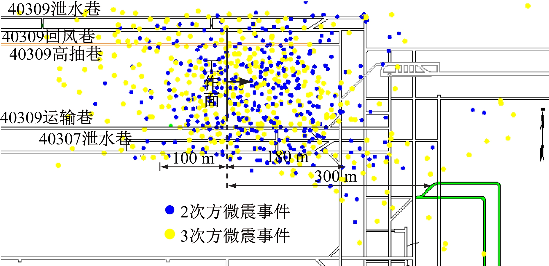 采用ARAMIS M/E微震监测系统监测40309工作面及附近区域微震情况。在中央进风大巷及东部辅助运输大巷布置3台微震拾震器,在40309回风巷及40307回风巷布置3台微震传感器,组成微震台网对40309工作面及附近巷道群区域进行微震监测,如图1所示。40309工作面回采末期微震事件平面投影如图3所示。采用固定工作面方法[13]绘制40309工作面回采末期沿工作面走向的微震频次、能量分布,如图4所示。可看出40309工作面回采末期微震频次、能量主要分布在工作面后方约100 m、工作面前方约180 m范围内;工作面超前区域微震事件集中在工作面前方0~180 m范围,最远影响范围达到工作面前方300 m,已影响至工作面附近联络巷、硐室及中央大巷区域,且工作面超前微震分布峰值范围为工作面前方80~120 m,该区域为工作面超前应力集中区域;在150 m宽度的大巷保护煤柱条件下,工作面回采至终采区域时,在工作面附近联络巷、硐室及中央大巷形成应力集中区。