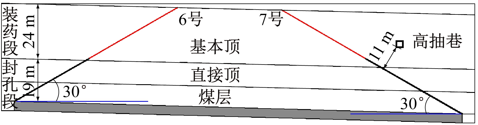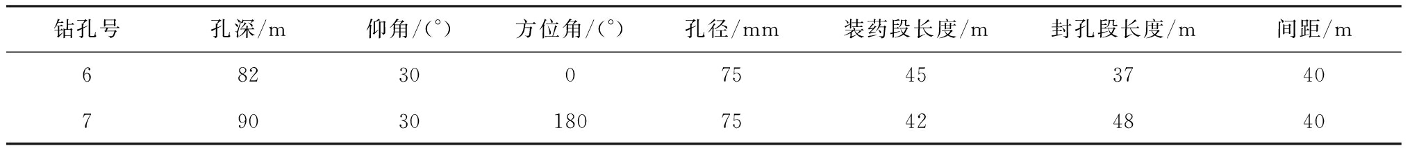 通过采取超深孔顶板预裂爆破措施,对40309工作面终采区域上覆坚硬顶板进行整体预裂,降低对工作面附近中央大巷区域的动载影响。在40309运输巷、40309回风巷终采区域施工2个超深顶板预裂爆破孔(编号为6,7),施工范围为设计终采线前后各40 m,如图10所示。根据40309工作面钻孔柱状图及巷道高程,设计顶板预裂爆破层位为煤层上覆基本顶粗砂岩,因此设计顶板预裂爆破孔垂深为43 m,装药段垂深为24 m,封孔段垂深为19 m。结合现场施工环境、钻机及机具、矿用炸药特性参数设计合理的爆破孔技术参数,具体见表2。
