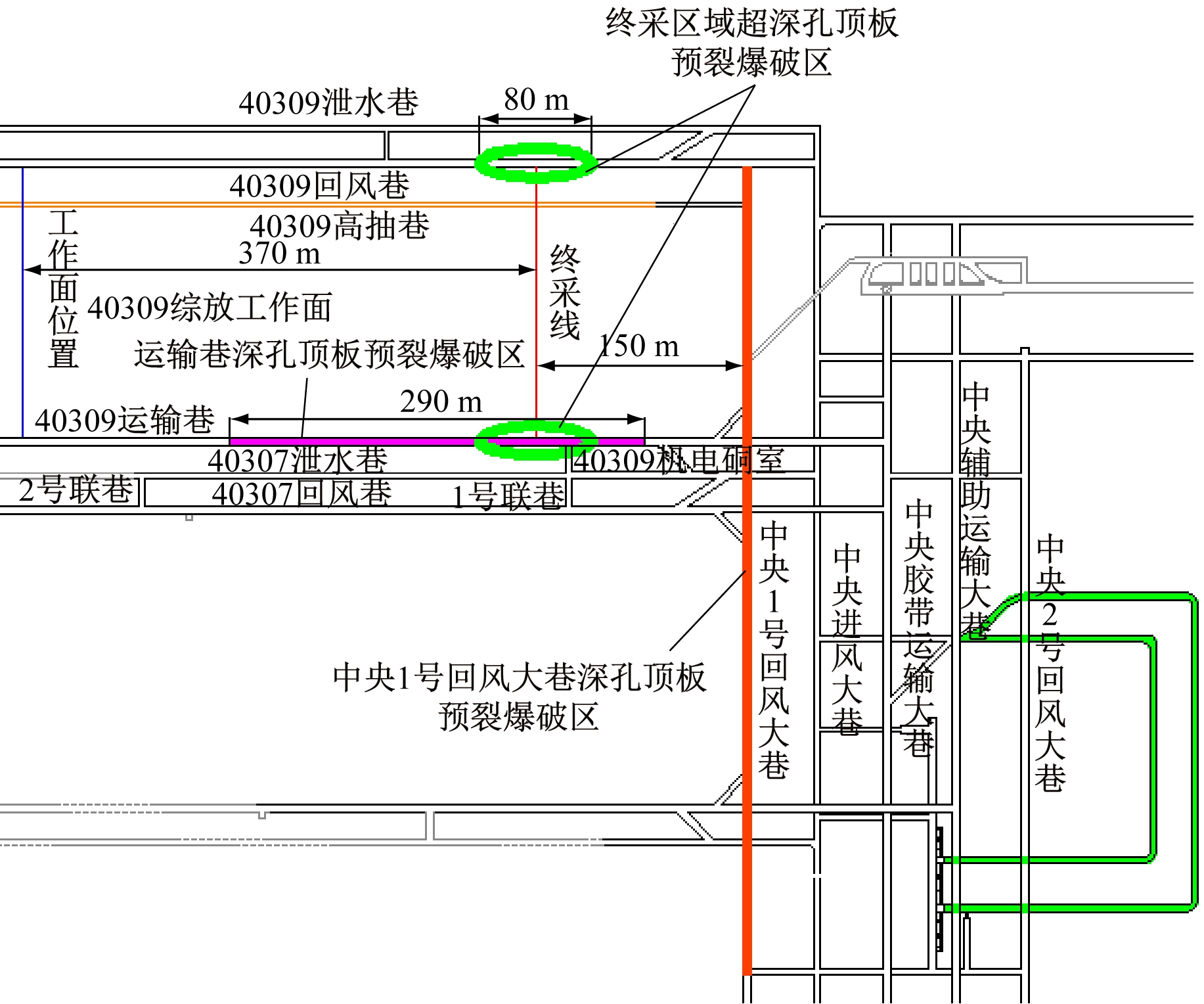 针对40309工作面整体上采用“分区分源”防冲卸压方案,顶板预裂爆破位置如图8所示。在40309运输巷采用深孔顶板预裂爆破方案,消除40309运输巷及附近巷道群区域因厚硬顶板产生的集中动静载荷源;在40309运输巷、回风巷终采区域,采用超深孔顶板预裂爆破方案,消除40309工作面厚硬顶板集中动静载荷源;在中央1号回风大巷采取深孔顶板预裂爆破方案,使40309工作面终采区域与中央大巷巷道群区域之间的厚硬顶板形成破裂裂隙,削弱40309工作面附近中央大巷区域厚硬顶板的连续性结构,减弱工作面超前集中应力传递,降低中央大巷区域的应力集中水平。